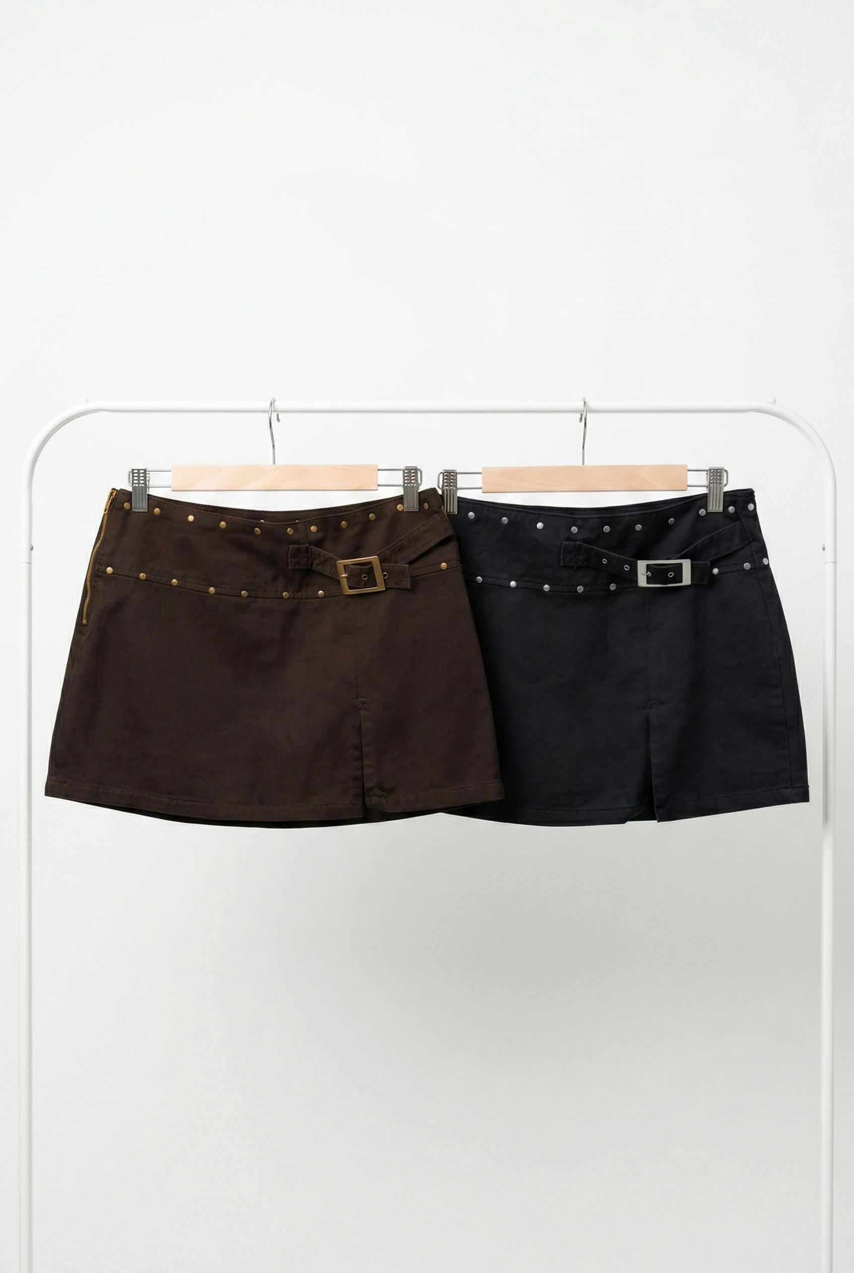 Short pollera de tiro bajo con tachas y hebilla de ajuste.