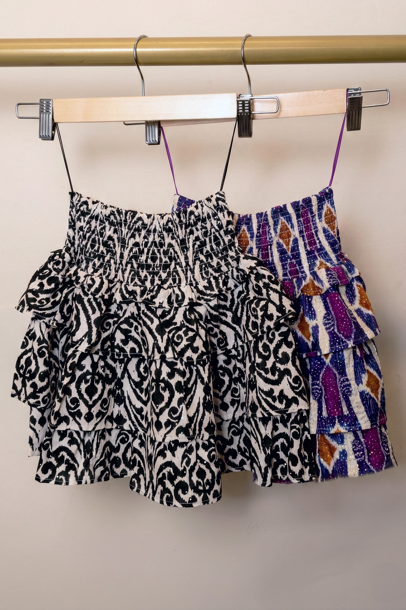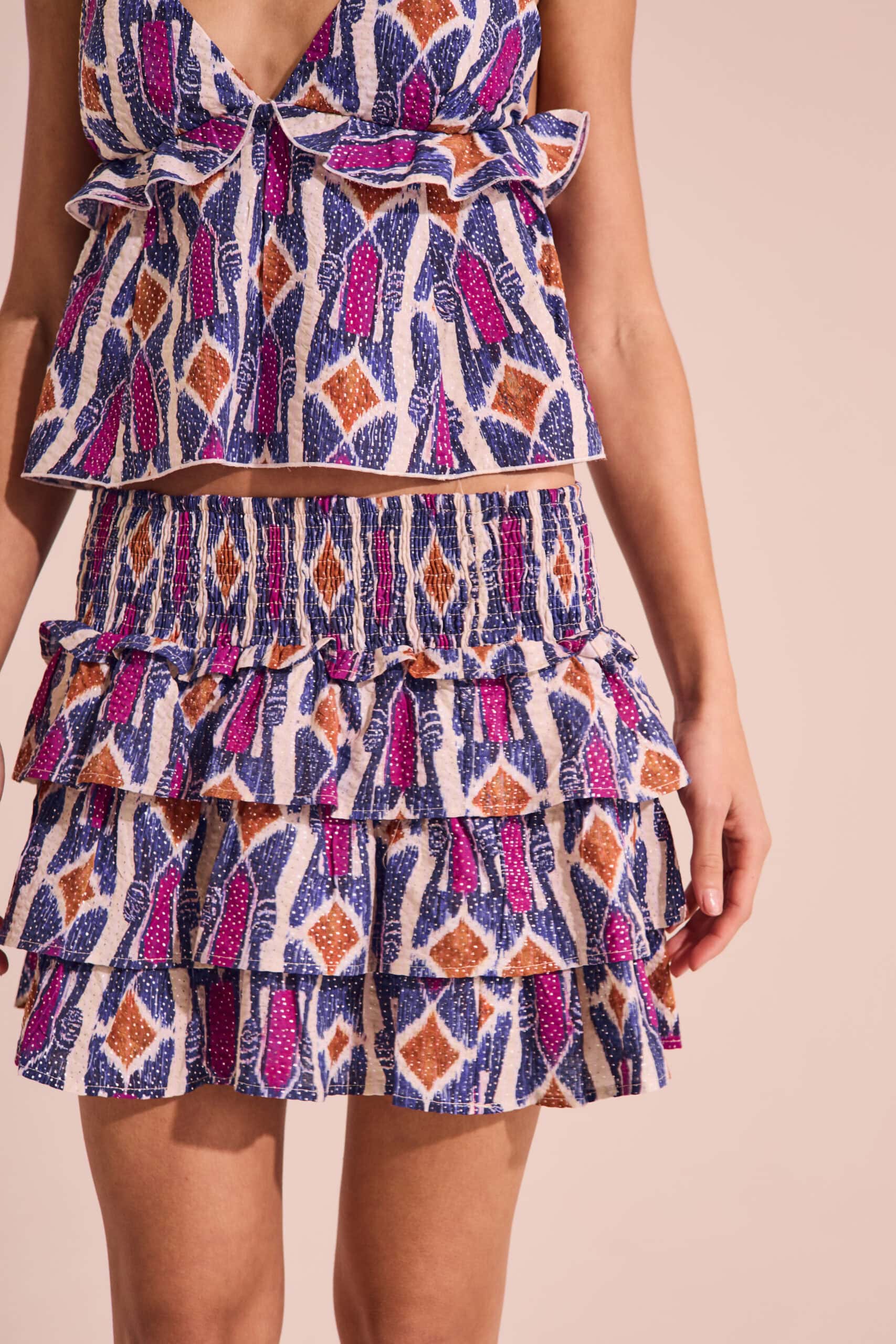 Mini falda tiro medio con cintura elástica y volados que recorren toda la falda.