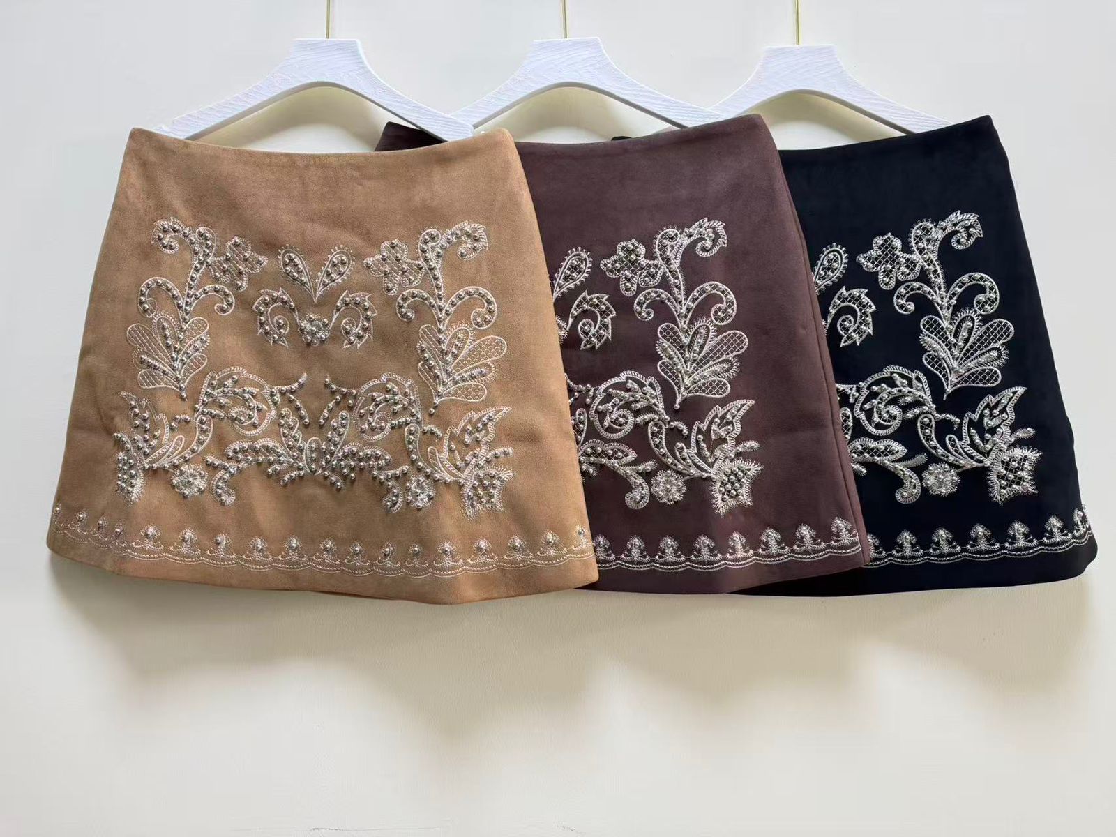 Pollera de mujer importado tiro alto de calce evasé, de largo modular mini. La prenda tiene un diseño abstracto bordado en el delantero, además, tiene un diseño de tachas bombé niqueladas sobre el bordado. El bordado y las tachas también recorren el ruedo delantero. La prenda está confeccionada en un símil suede y está completamente forrada con tafeta al tono.