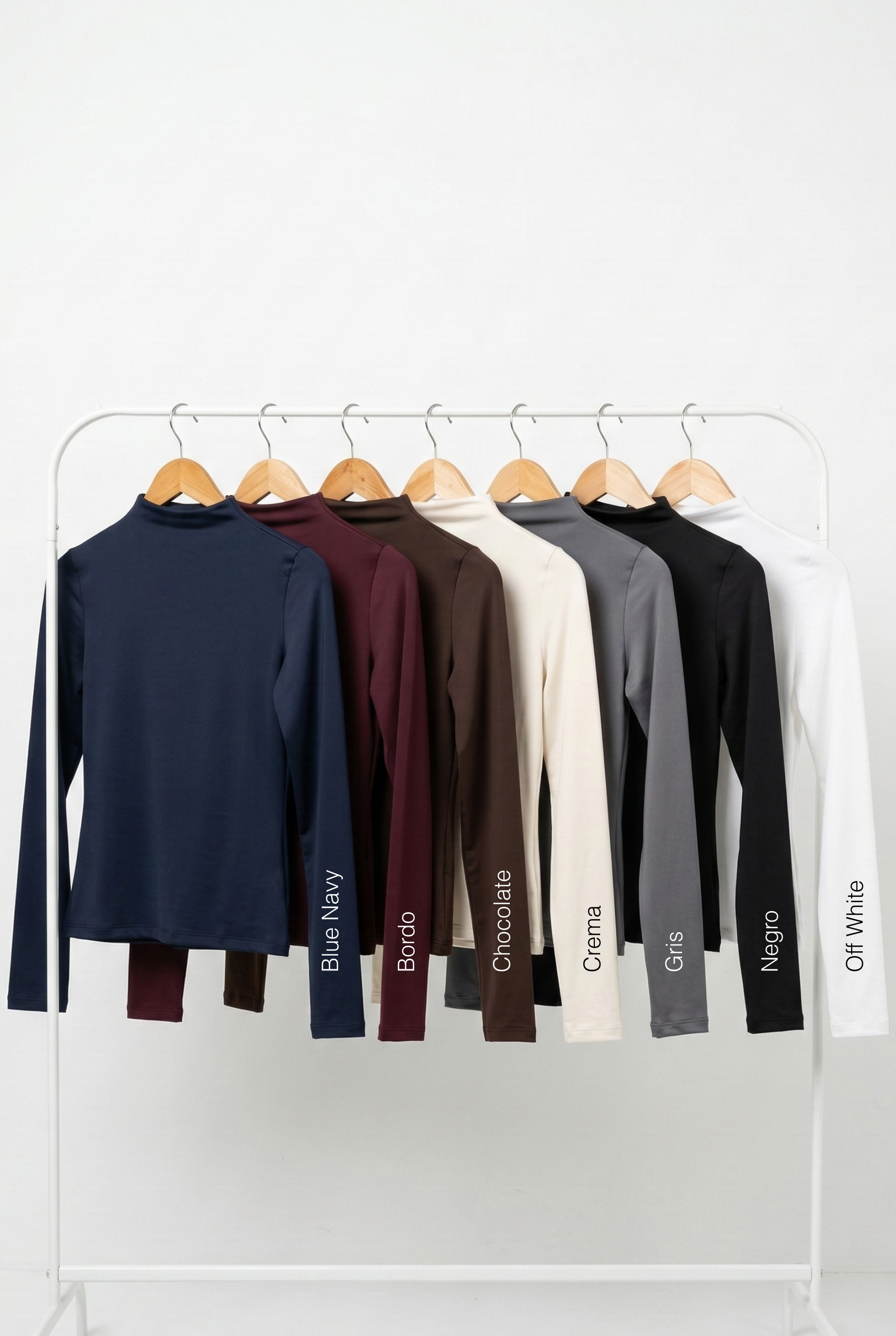 Remera de mujer manga larga de cuello subido de calce adherente. Confeccionada en microfibra.