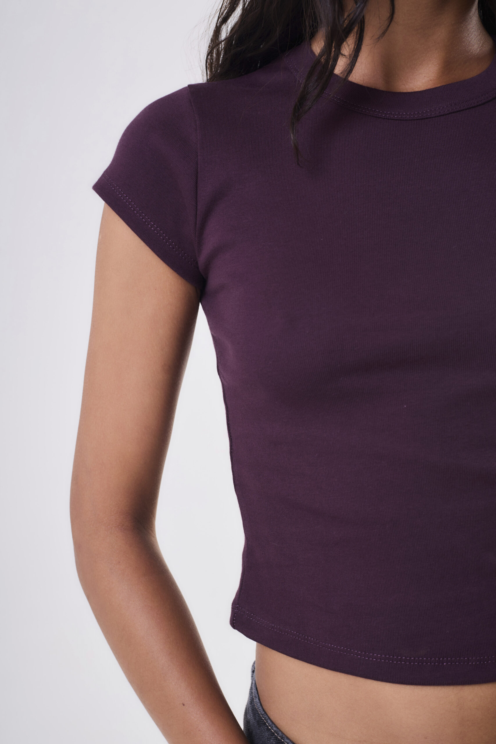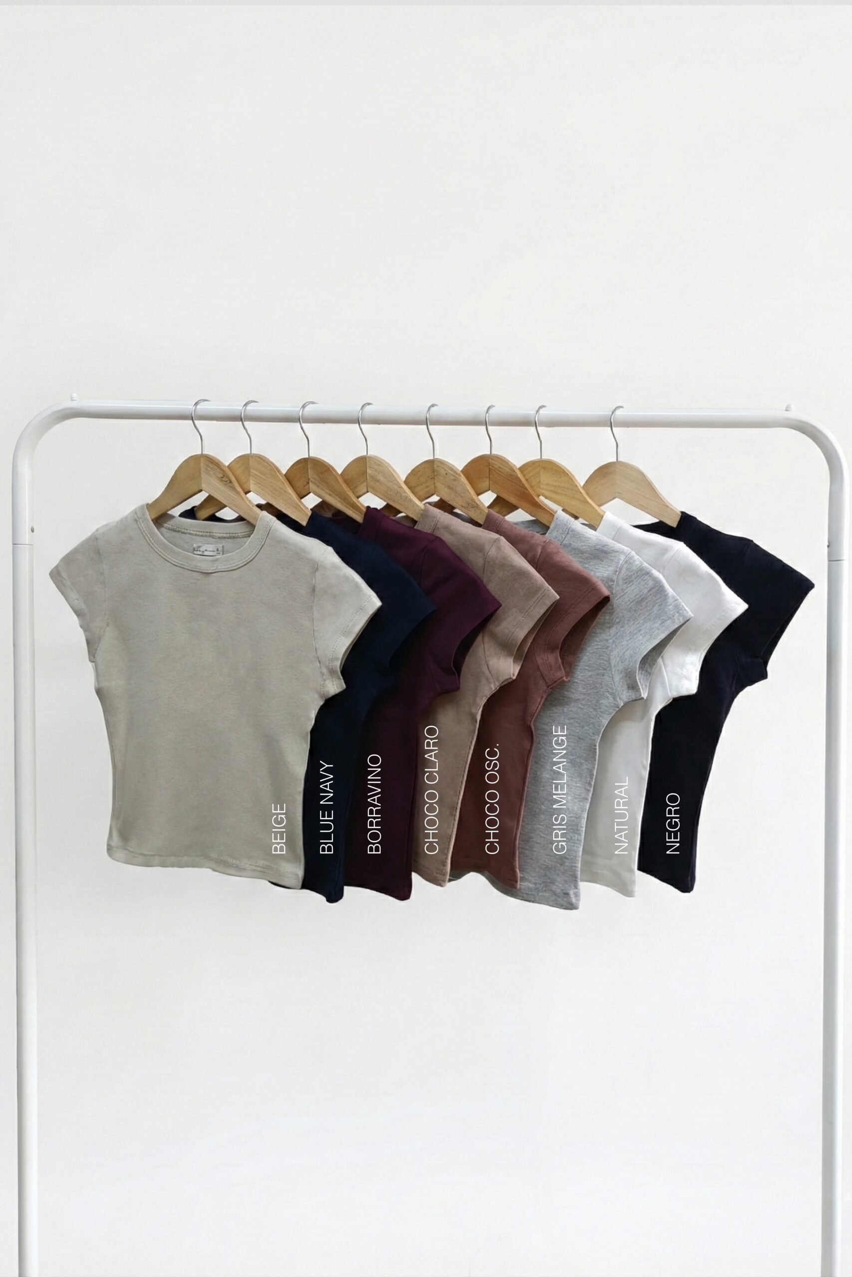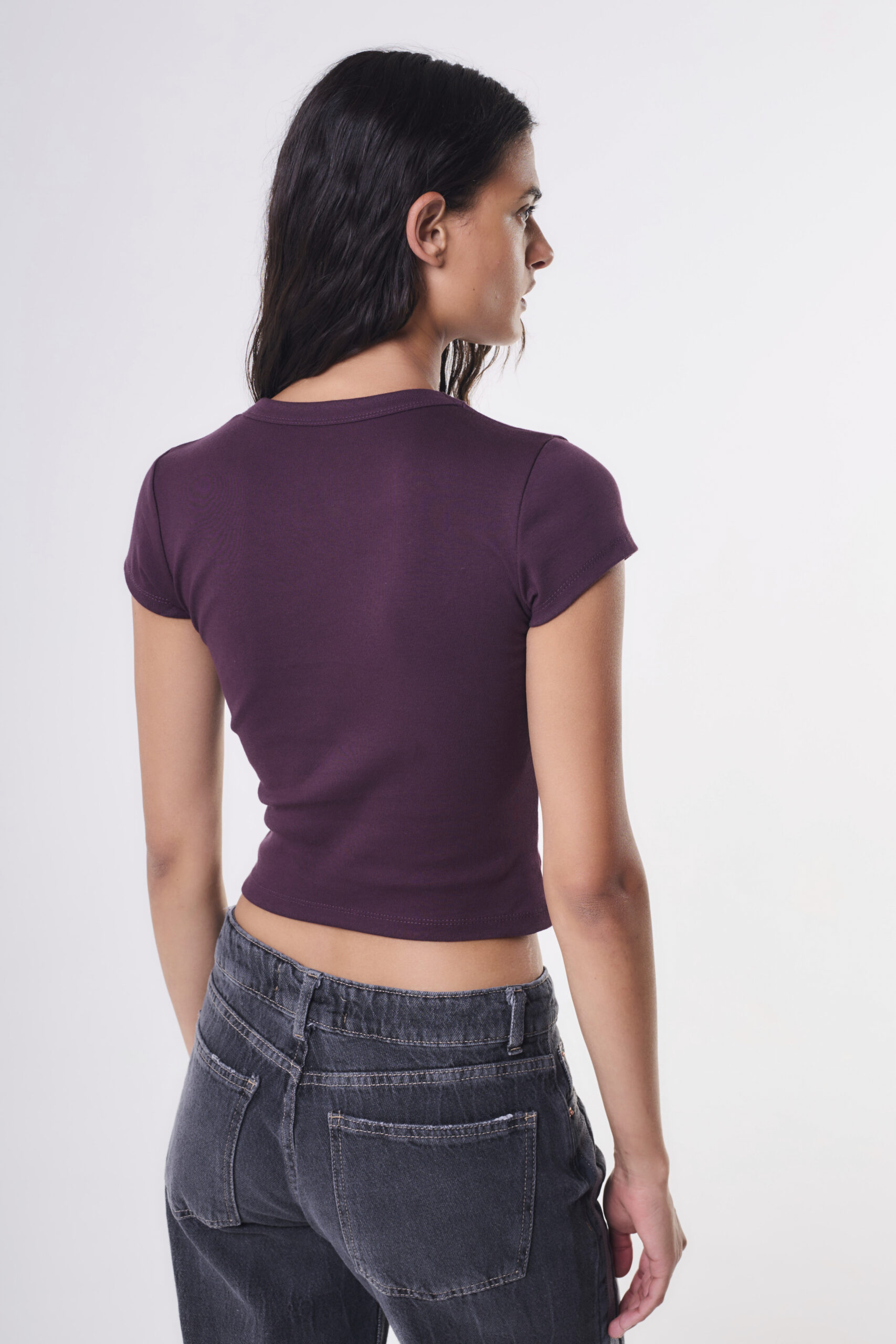 Remera de mujer basica con cuello subido y con collareta ancha con mangas cortas. Confeccionada en rib de algodón.