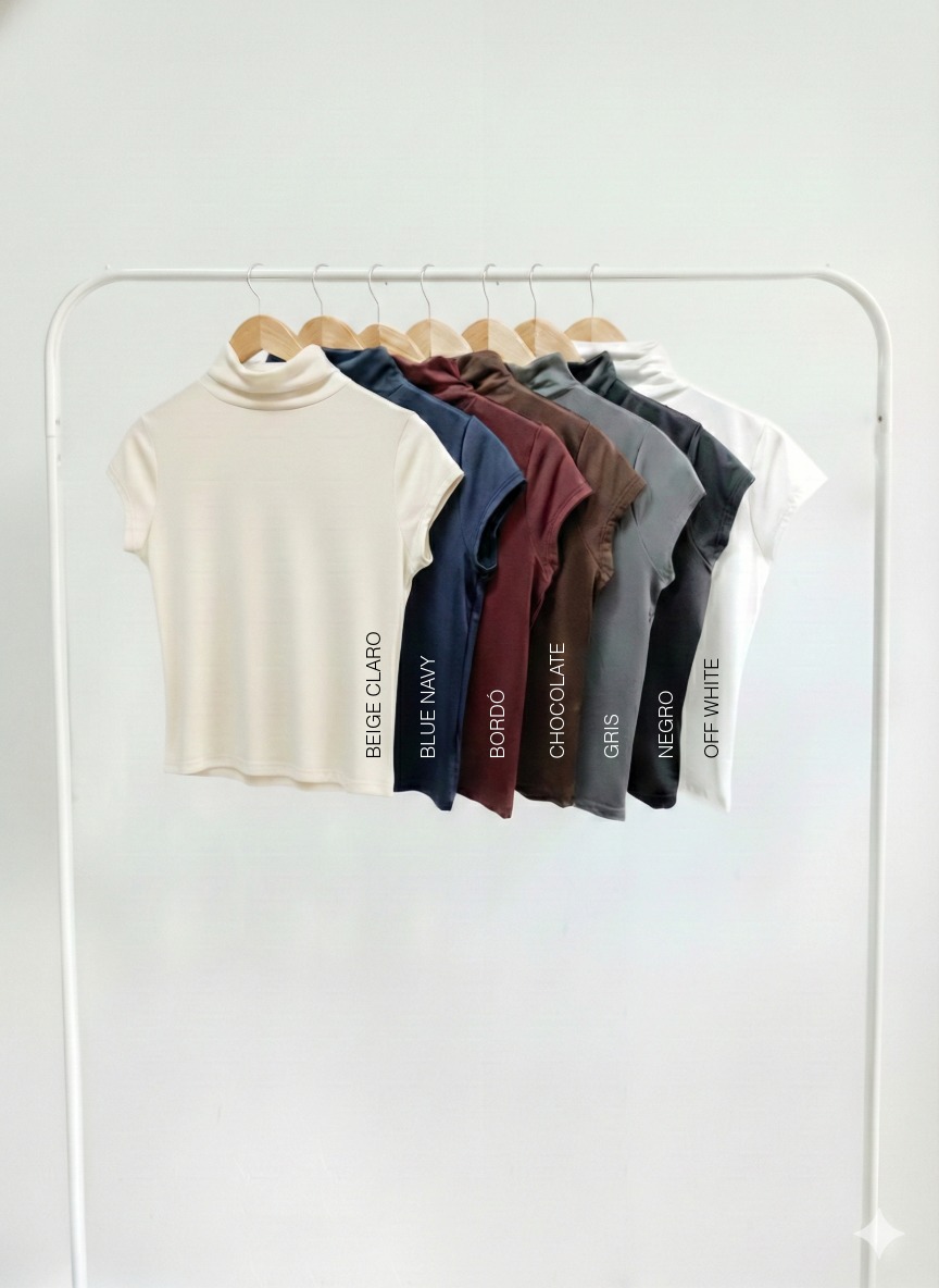 Remera de mujer manga corta de calce adherente. Tiene cuello subido y mangas cortas, con largo modular hasta primera cadera. Confeccionada en microfibra.