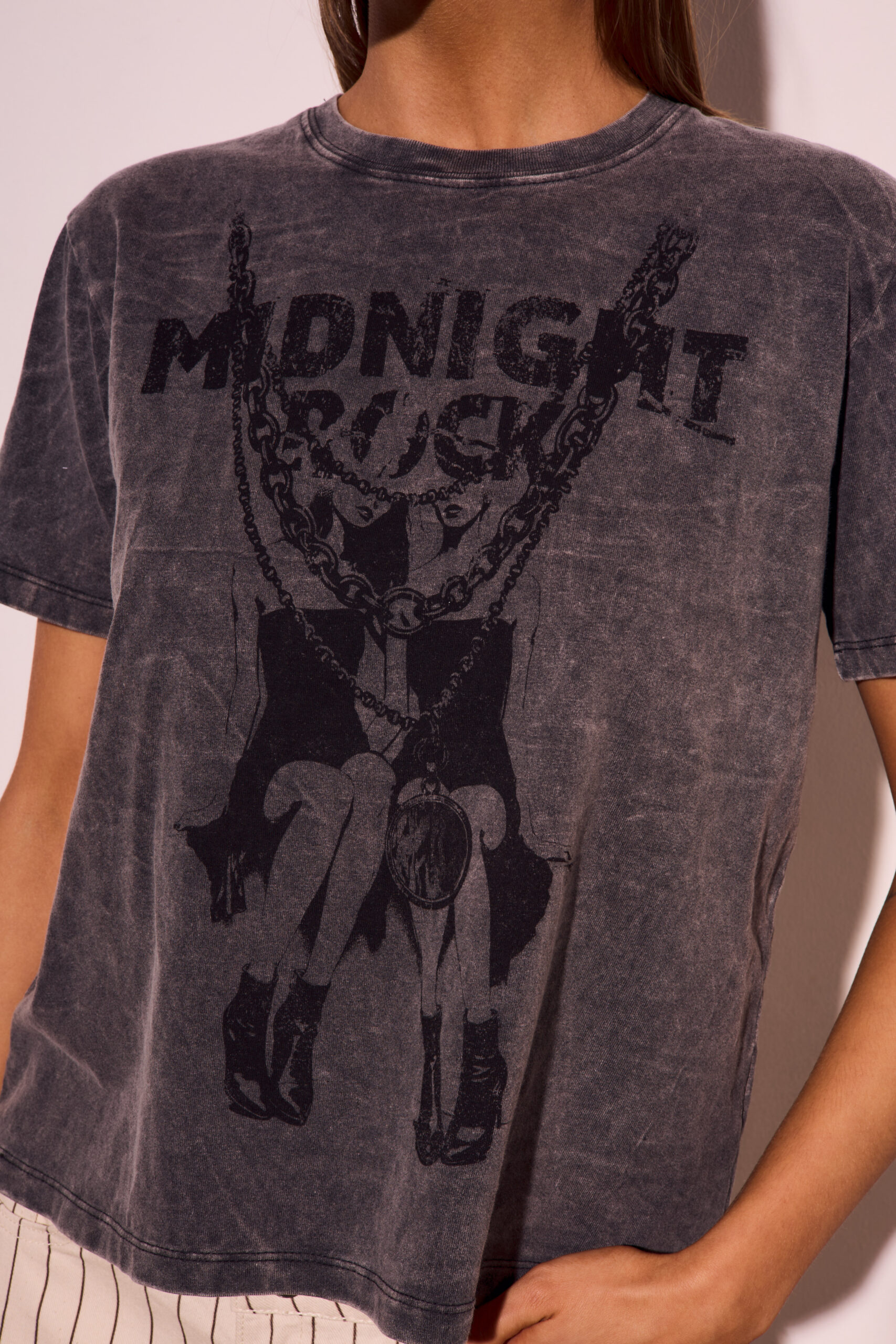 Remera de mujer de calce oversize manga corta con rib al tono en cuello. Lleva estampa en delantero y espalda al igual que proceso de lavado acid wash y antipeeling. Confeccionado en jersey de algodón pesado.