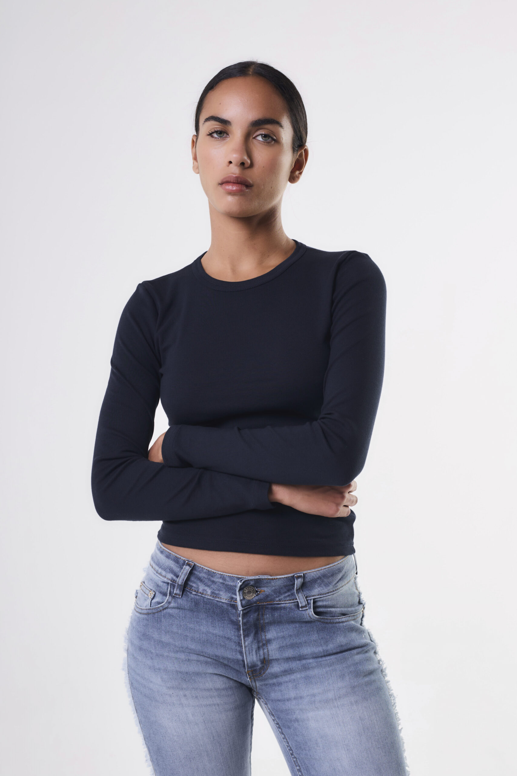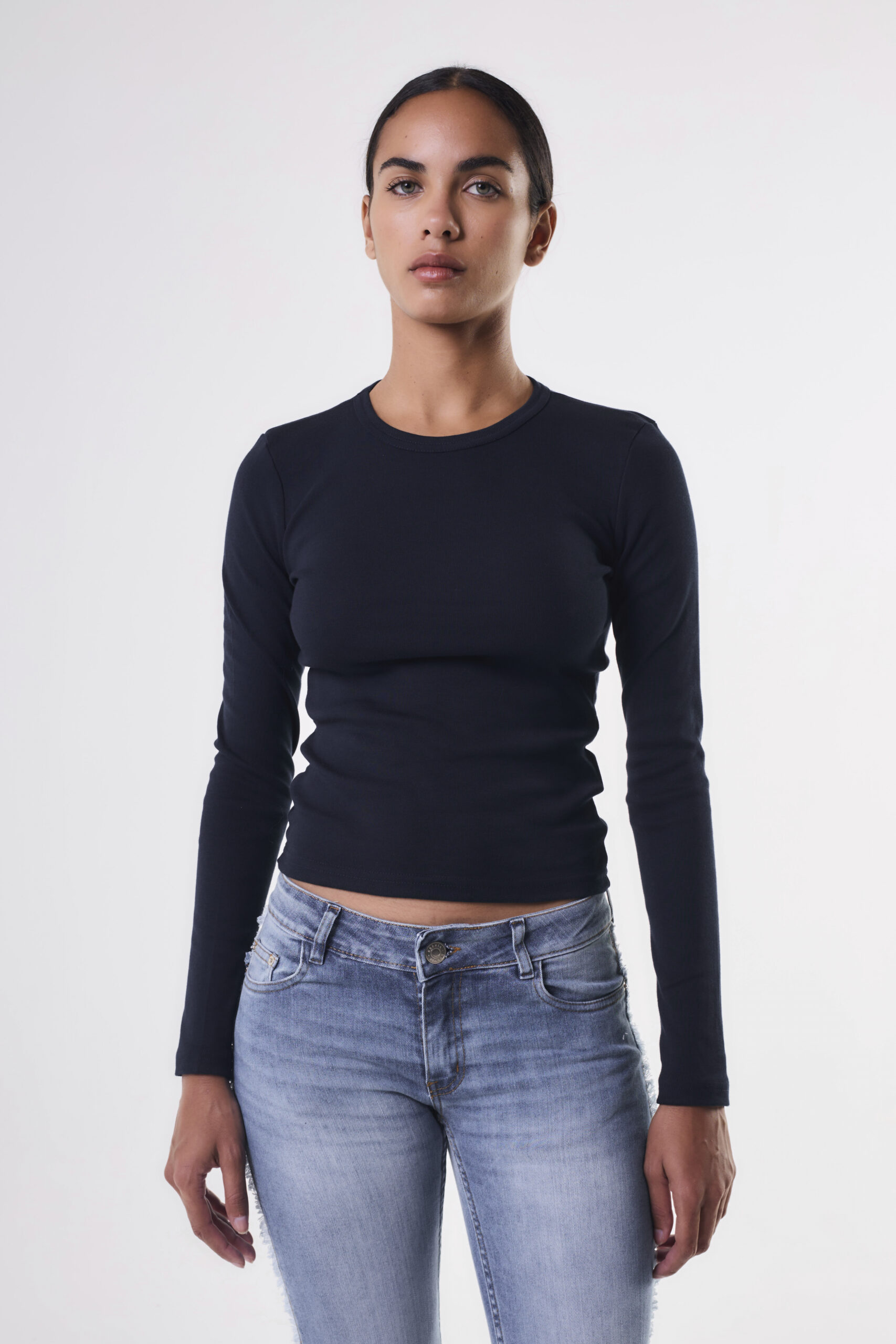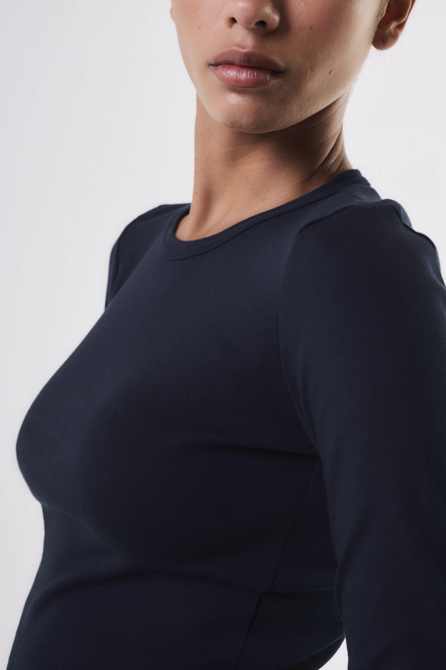 Remera de mujer con manga larga. Cuello redondo con largo modular hasta primera cadera. La prenda tiene calce adherente y está confeccionada en morley de algodón.