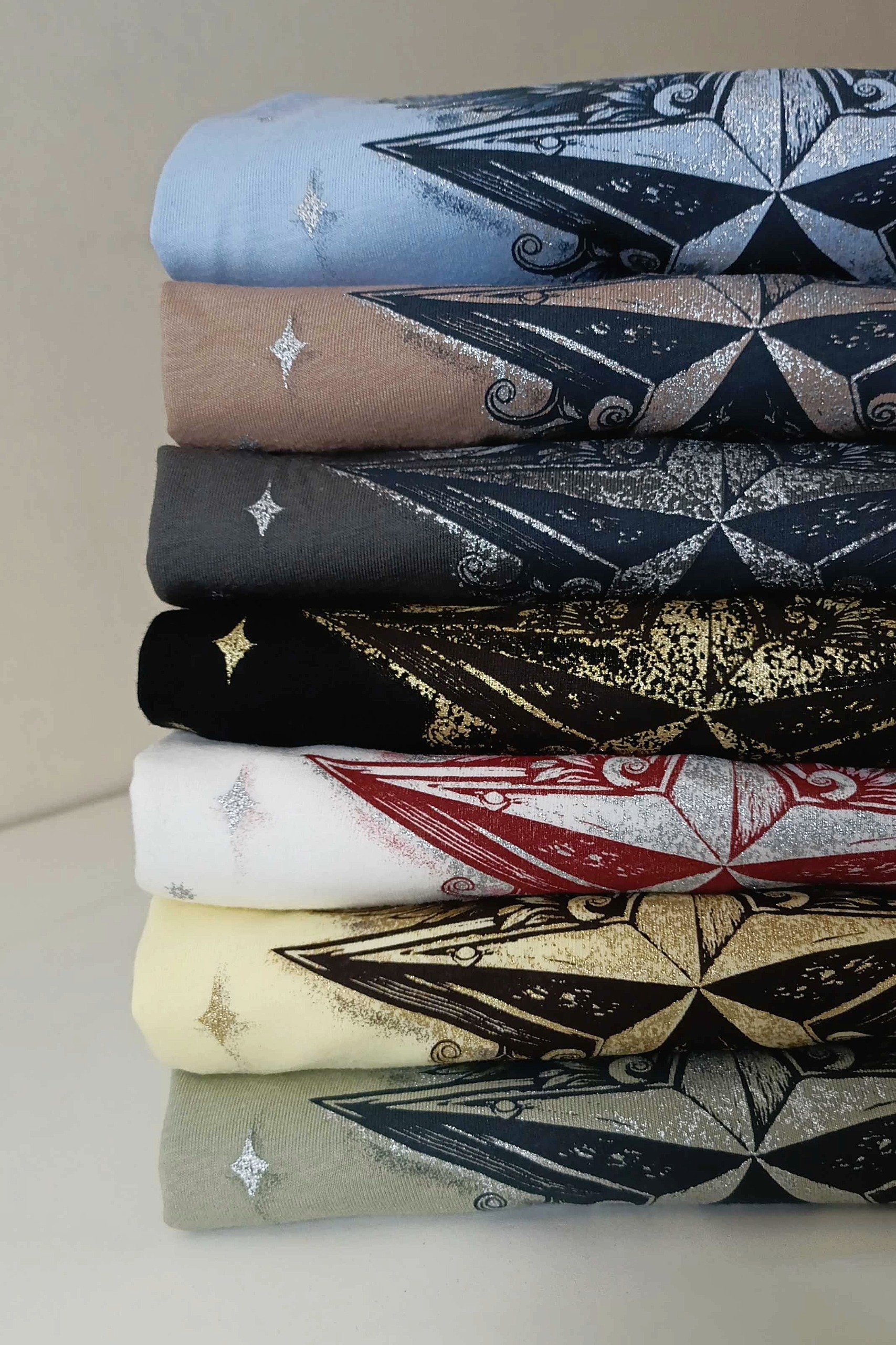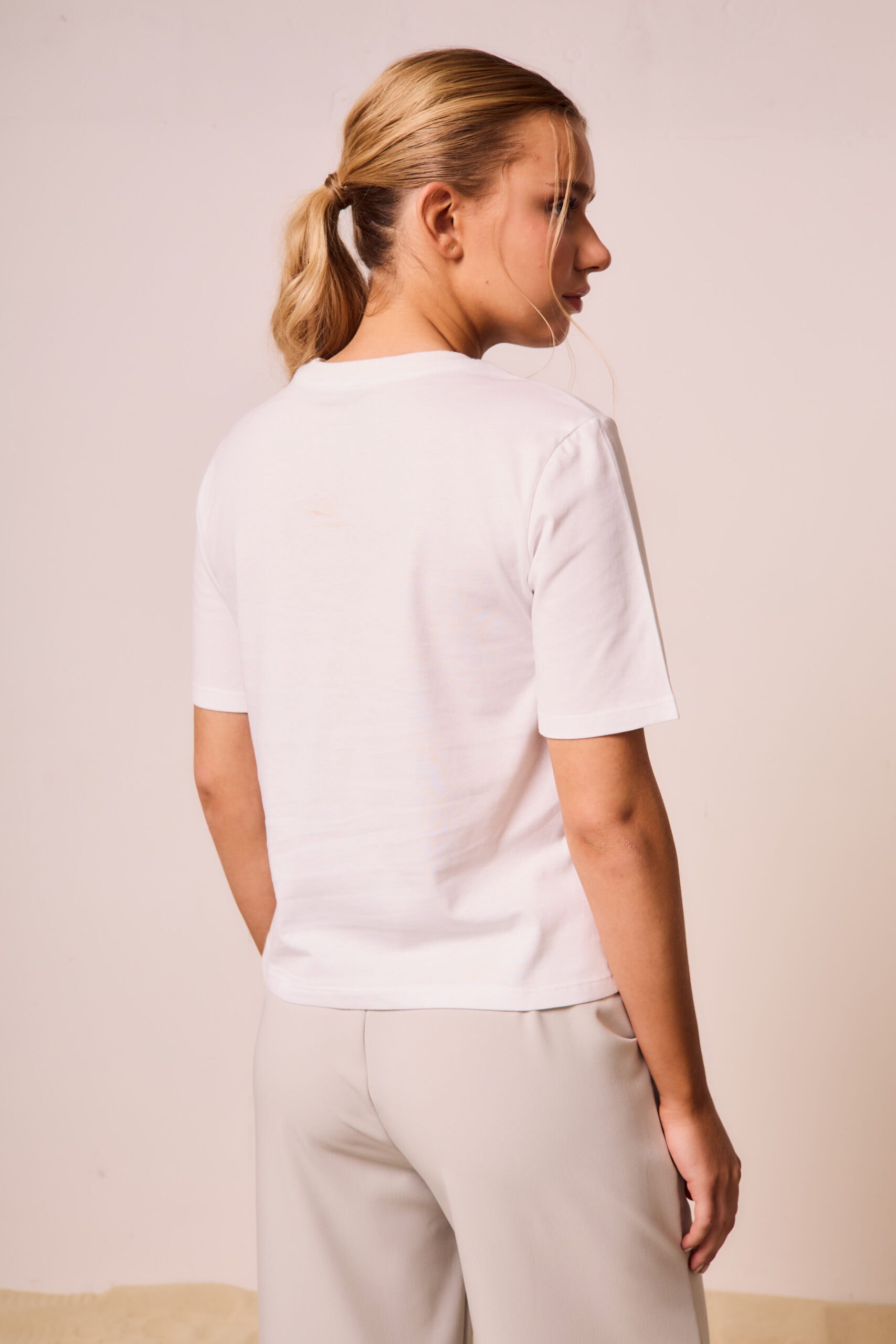 Remera de mujer basica con cuello con complento rib + estampa de diseño exclusivo de la marca con detalles de tinta foil