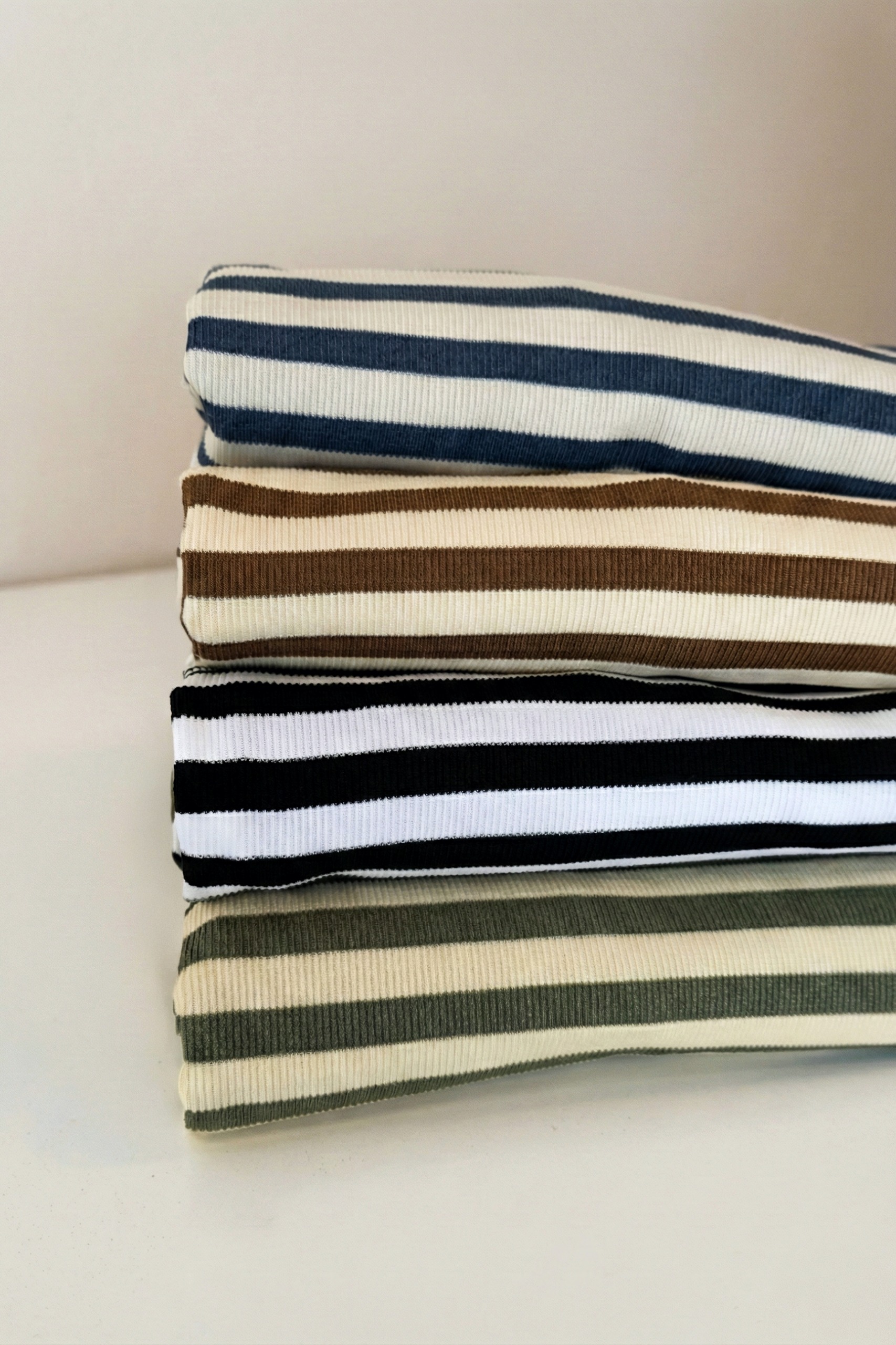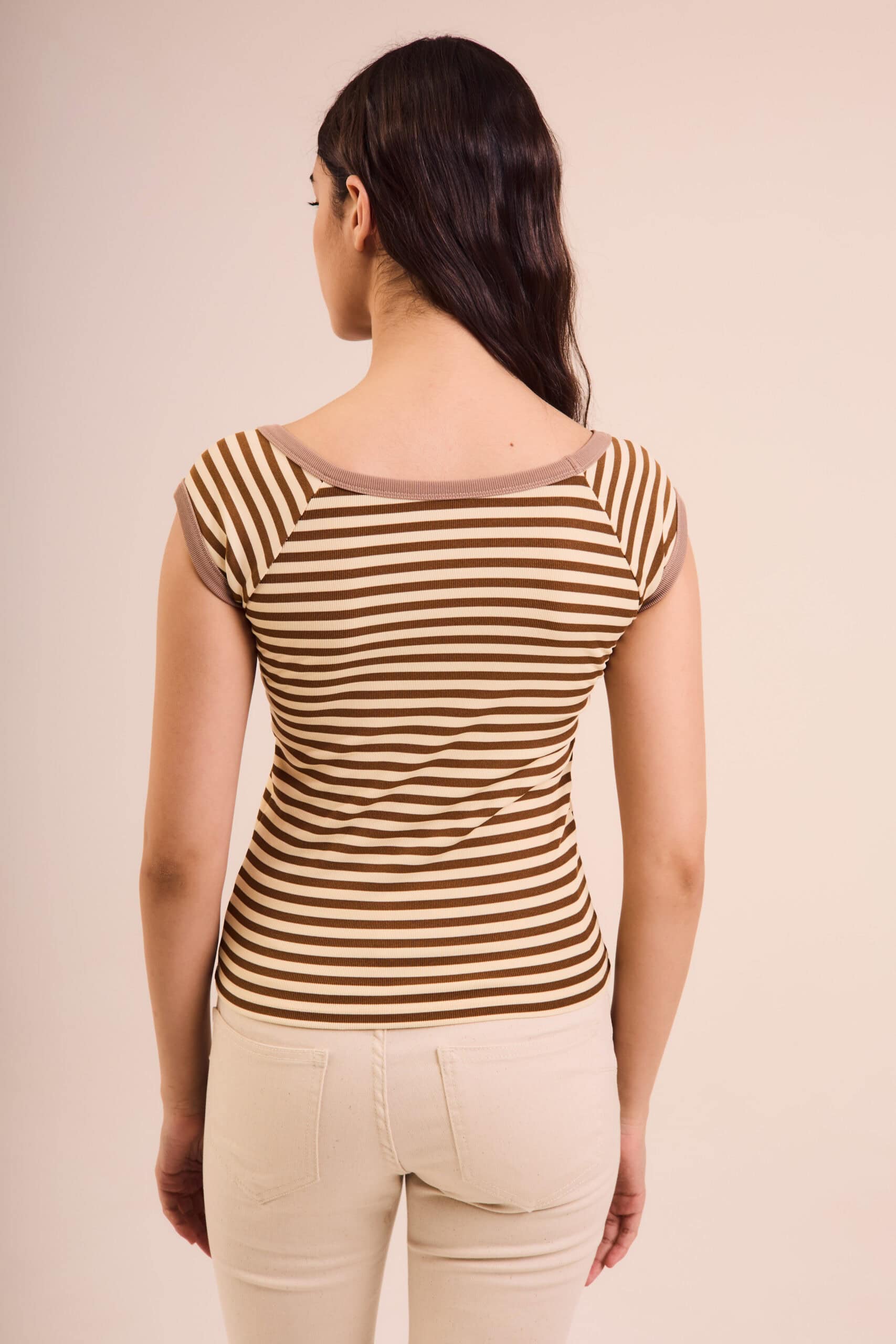 Remera de mujer calce adherente y largo modular hasta primera cadera. Lleva escote redondo y mangas cortas raglan. Lleva collareta en sobretono liso en cuello y mangas. Confeccionada en morley rayado.