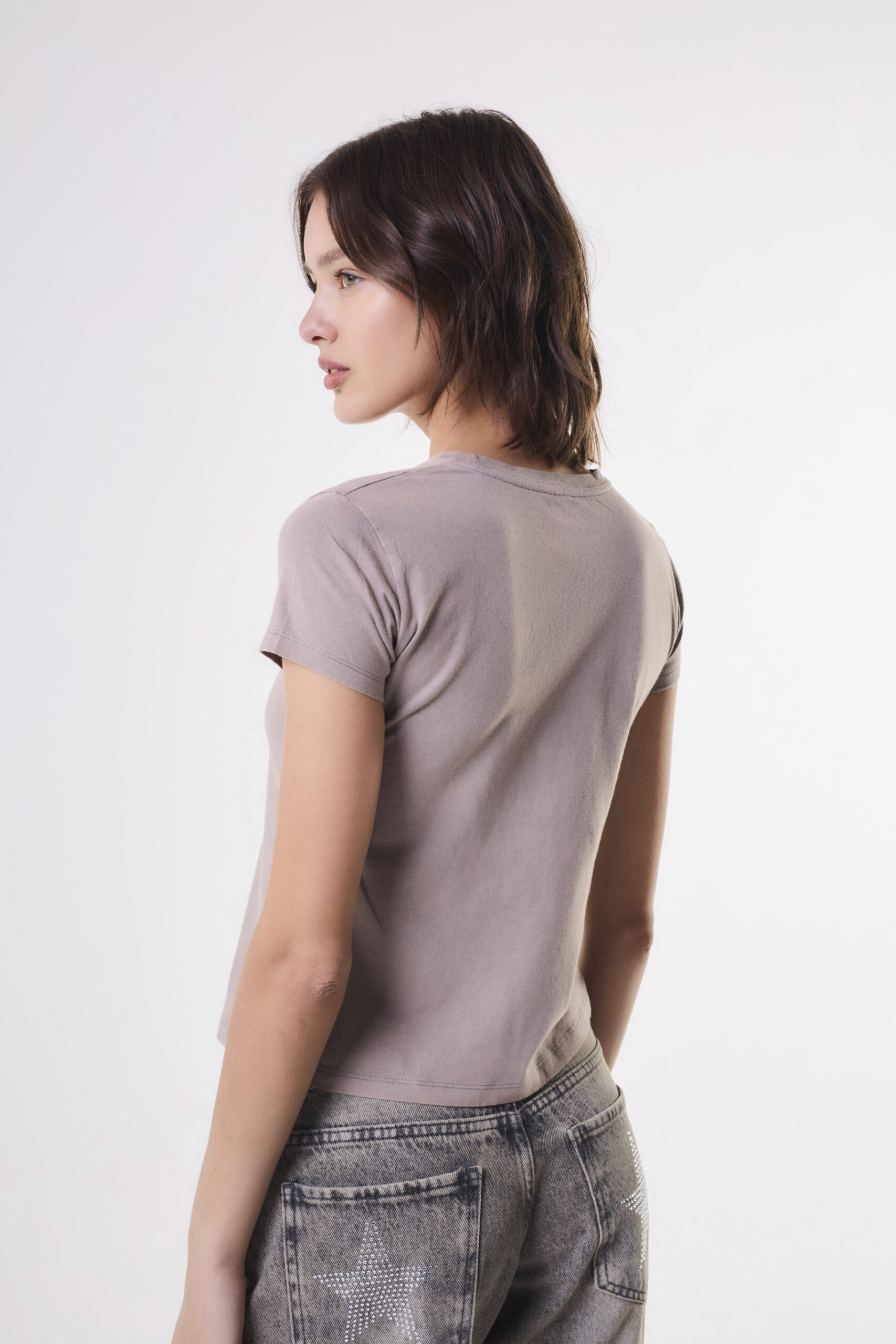 Remera de mujer estilo baby tee manga corta con cuello redondo con terminación en collareta. Lleva proceso de lavado acid wash en prenda y diseño central de hotfix facetado 2mm. Confeccionado en jersey de algodón.