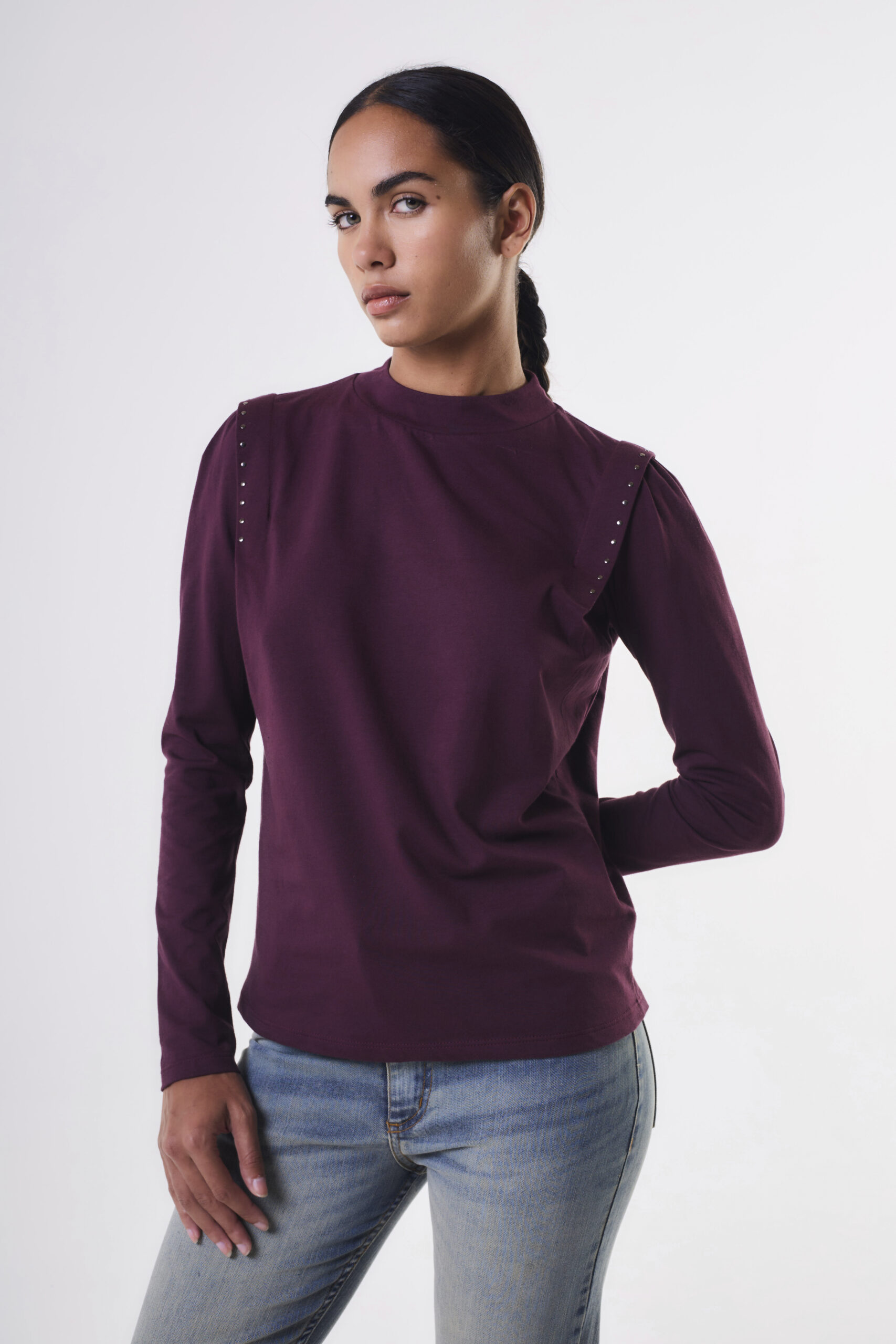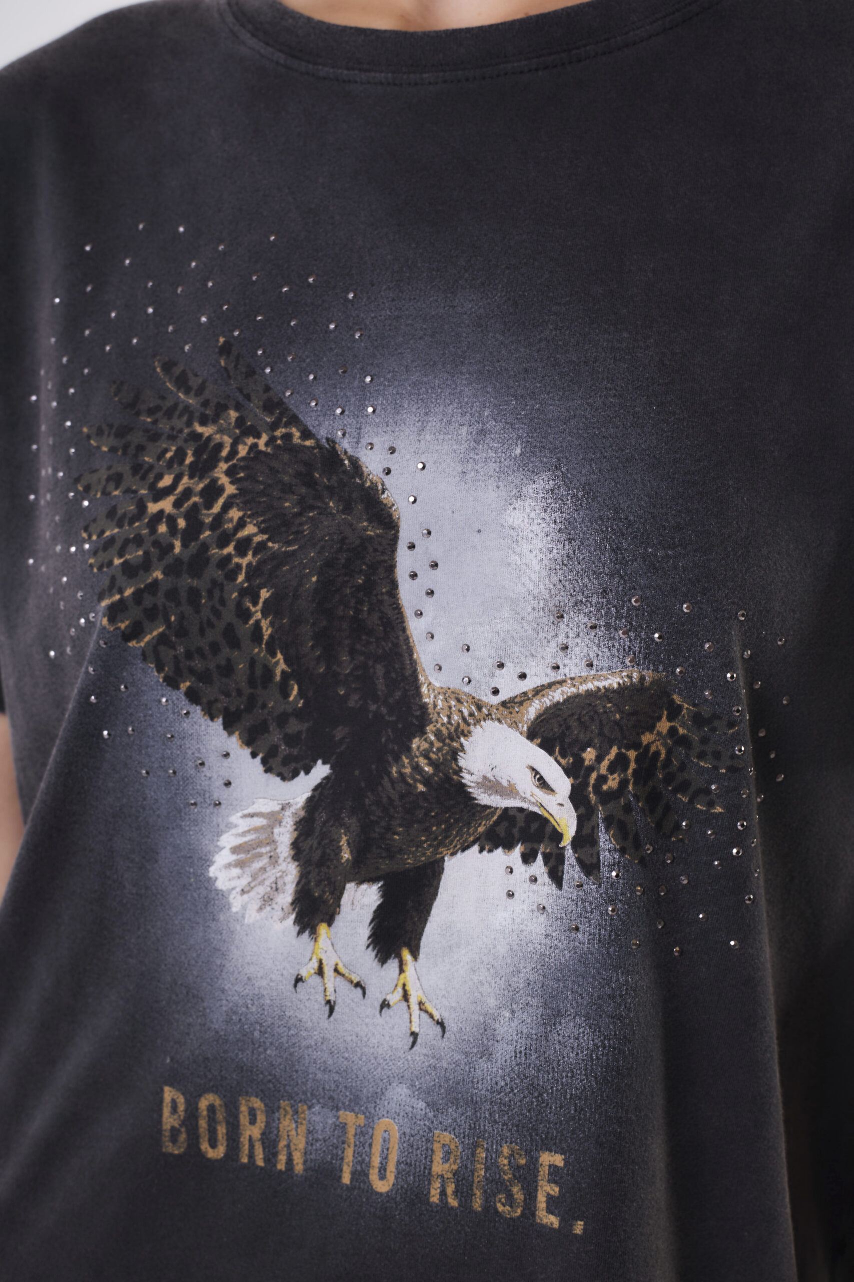 Remera de mujer calce relajado en prenda lavada y con proceso antipeeling / con estampa de diseño exclusivo con detalles de hotfix