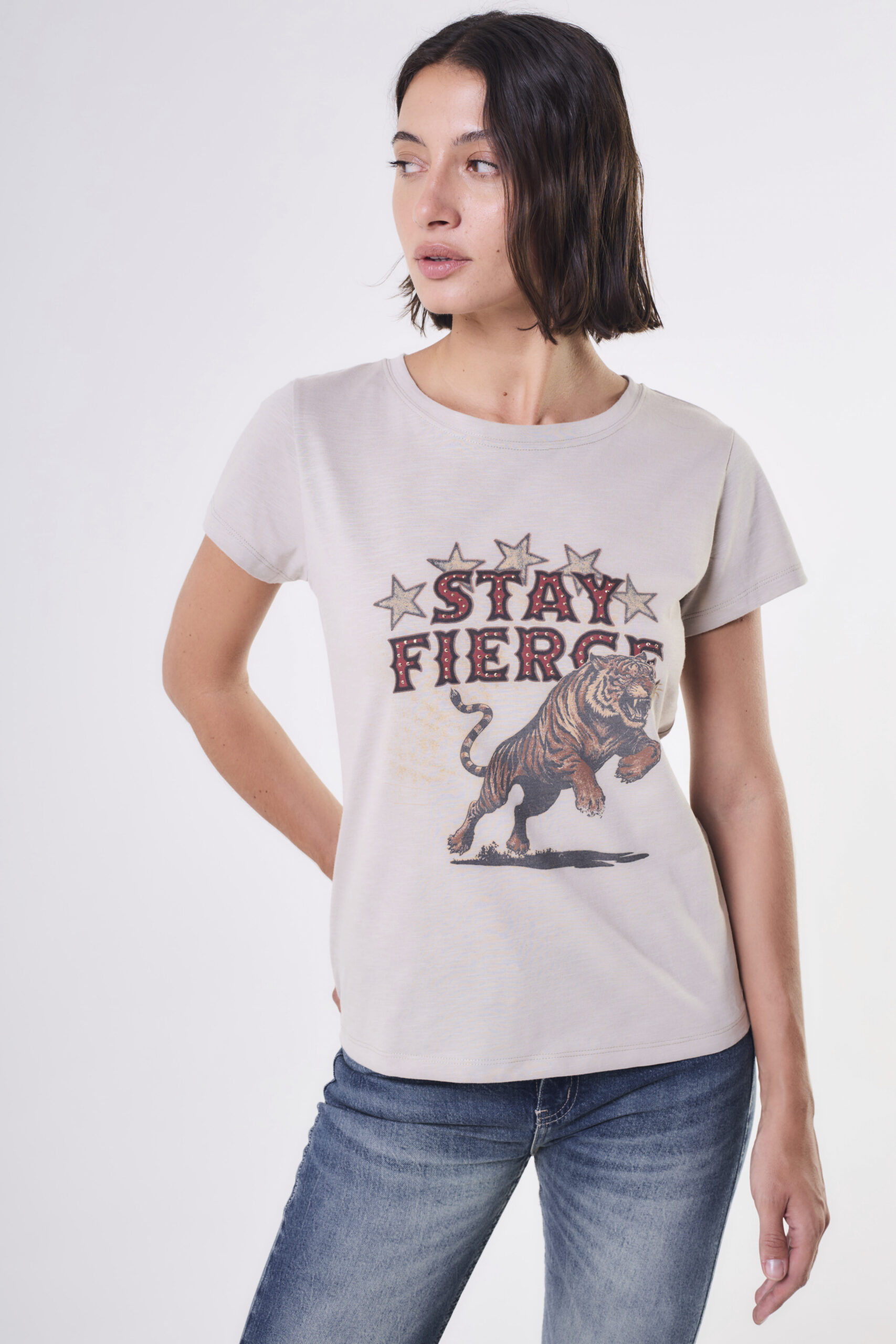 Remera de mujer calce regular con cuello redondo, hecha en jersey algodon flame con estampa exclusiva de la marca con detalles de hotfix