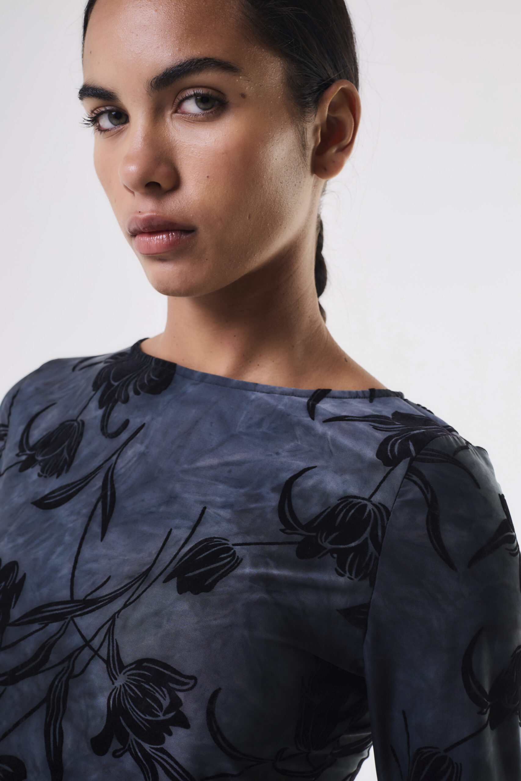 Remera de mujer de calce adherente con largo modular asimétrico. Lleva mangas largas y cuello redondo. La remera está confeccionada en una microfibra diferenciada, con un lavado vintage y un diseño floral en flock.