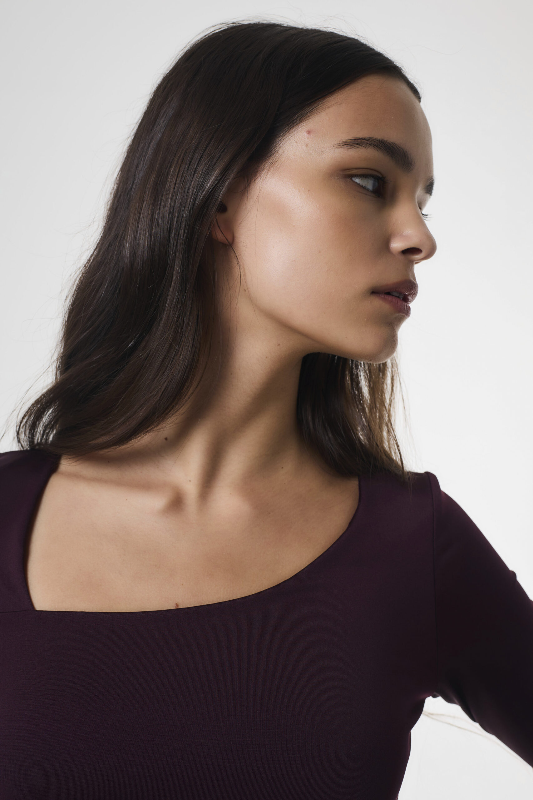 Remera de mujer de calce adherente con largo modular hasta primera cadera. Lleva mangas largas y escote asimétrico. La remera está confeccionada en microfibra. 92% Poliéster 8% Spandex La modelo está usando talle S color Plum.