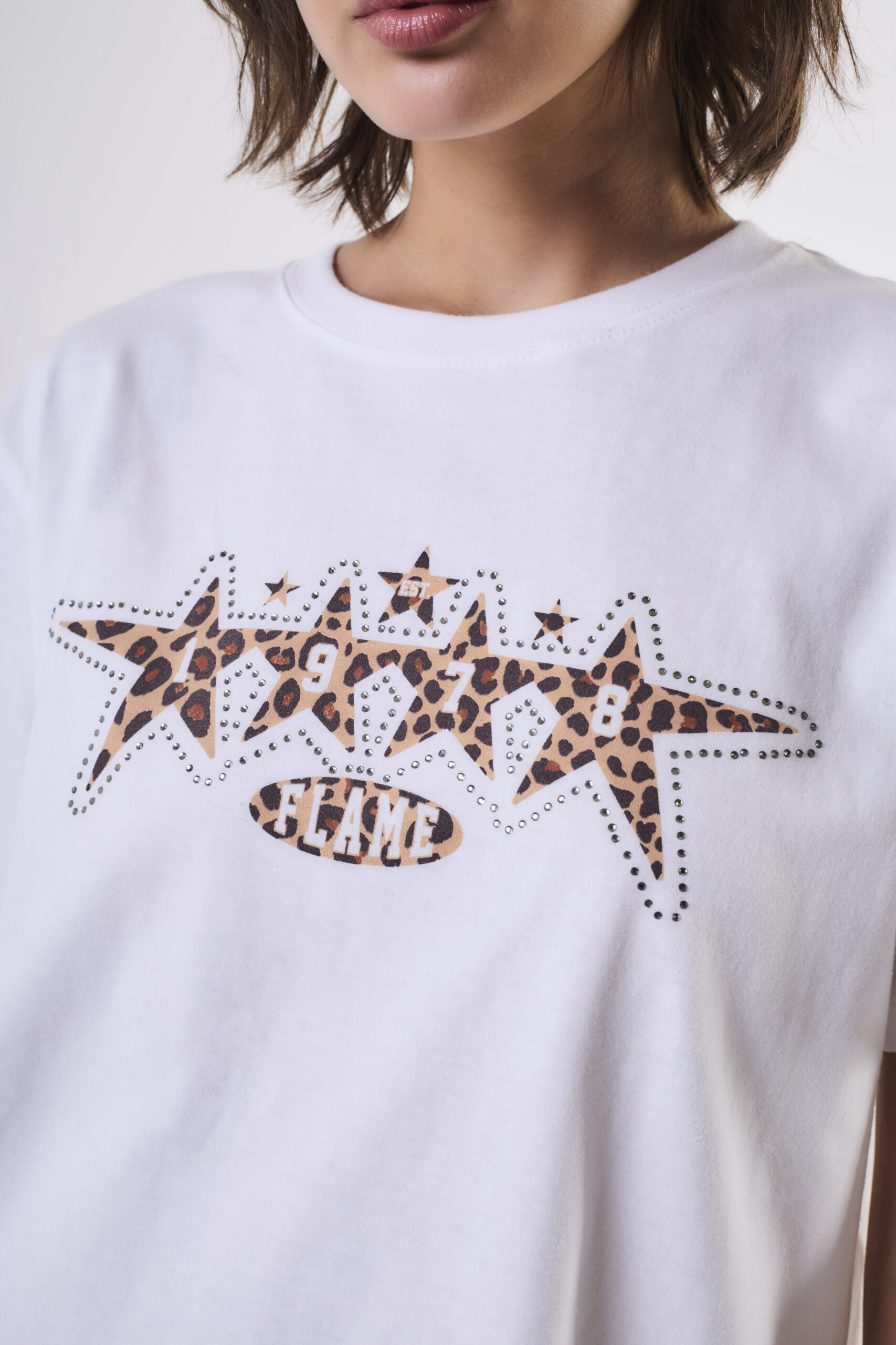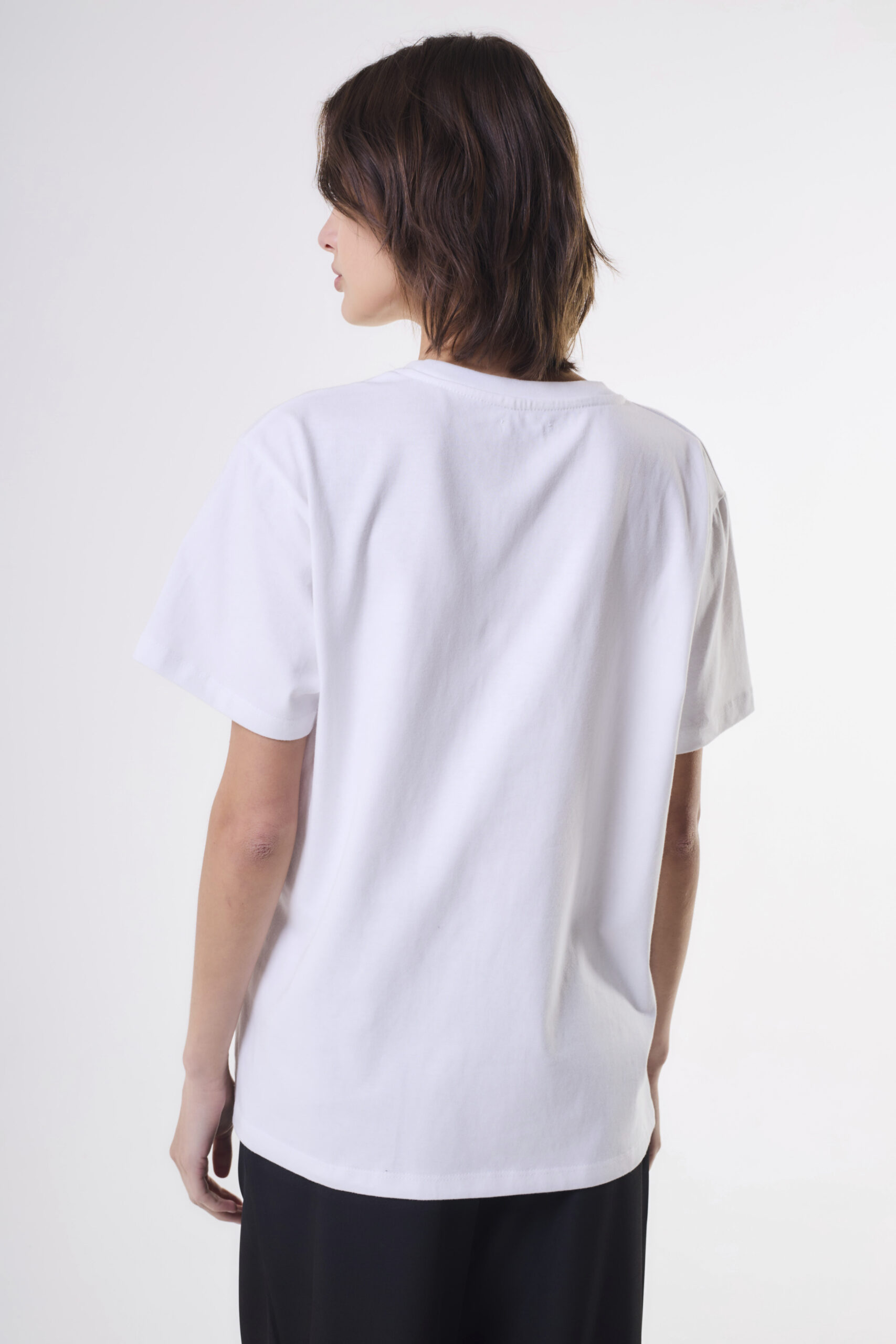 Remera de mujer de calce relajado con rib en cuello hecha en jersey 16/1 con estampa central en delantero.