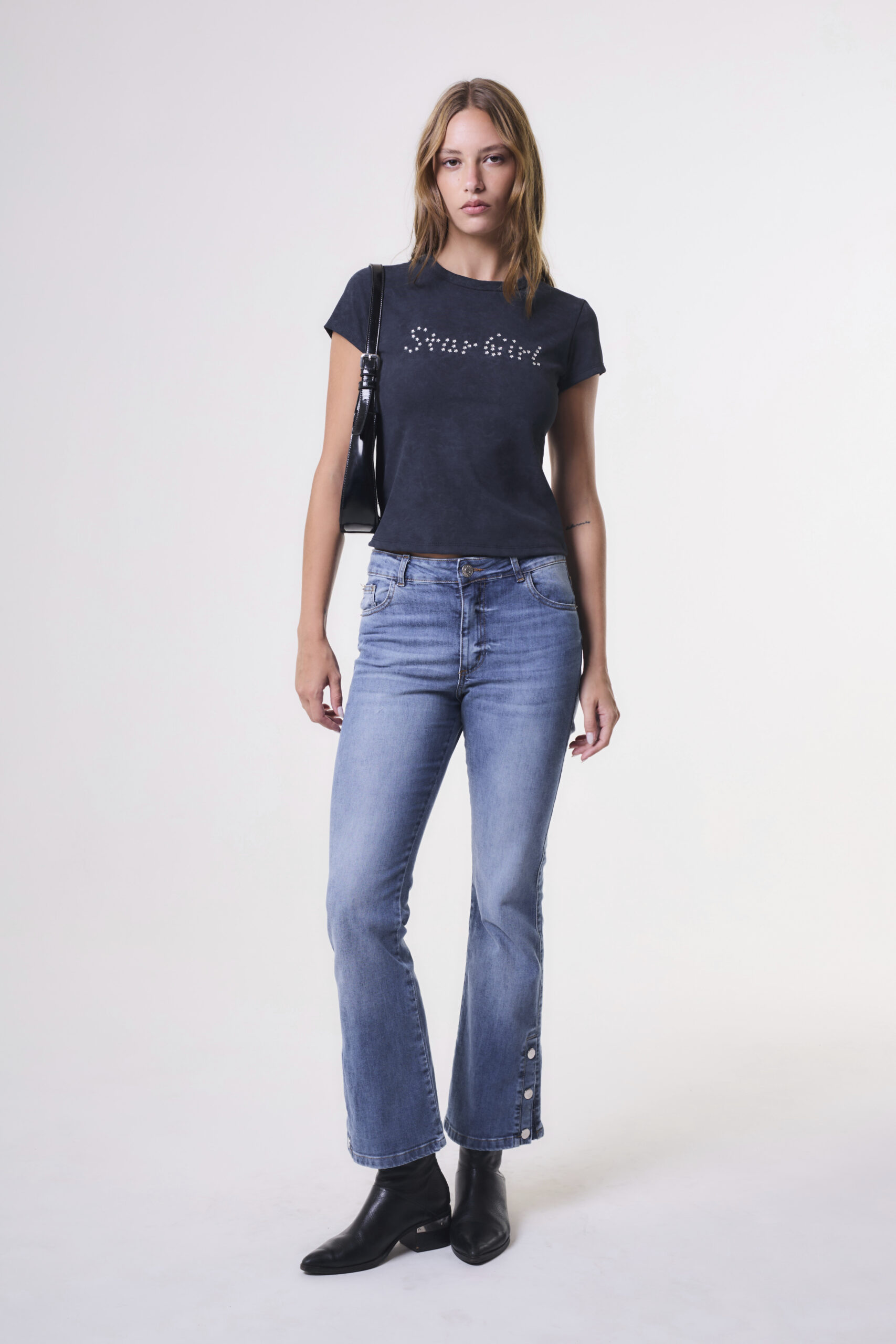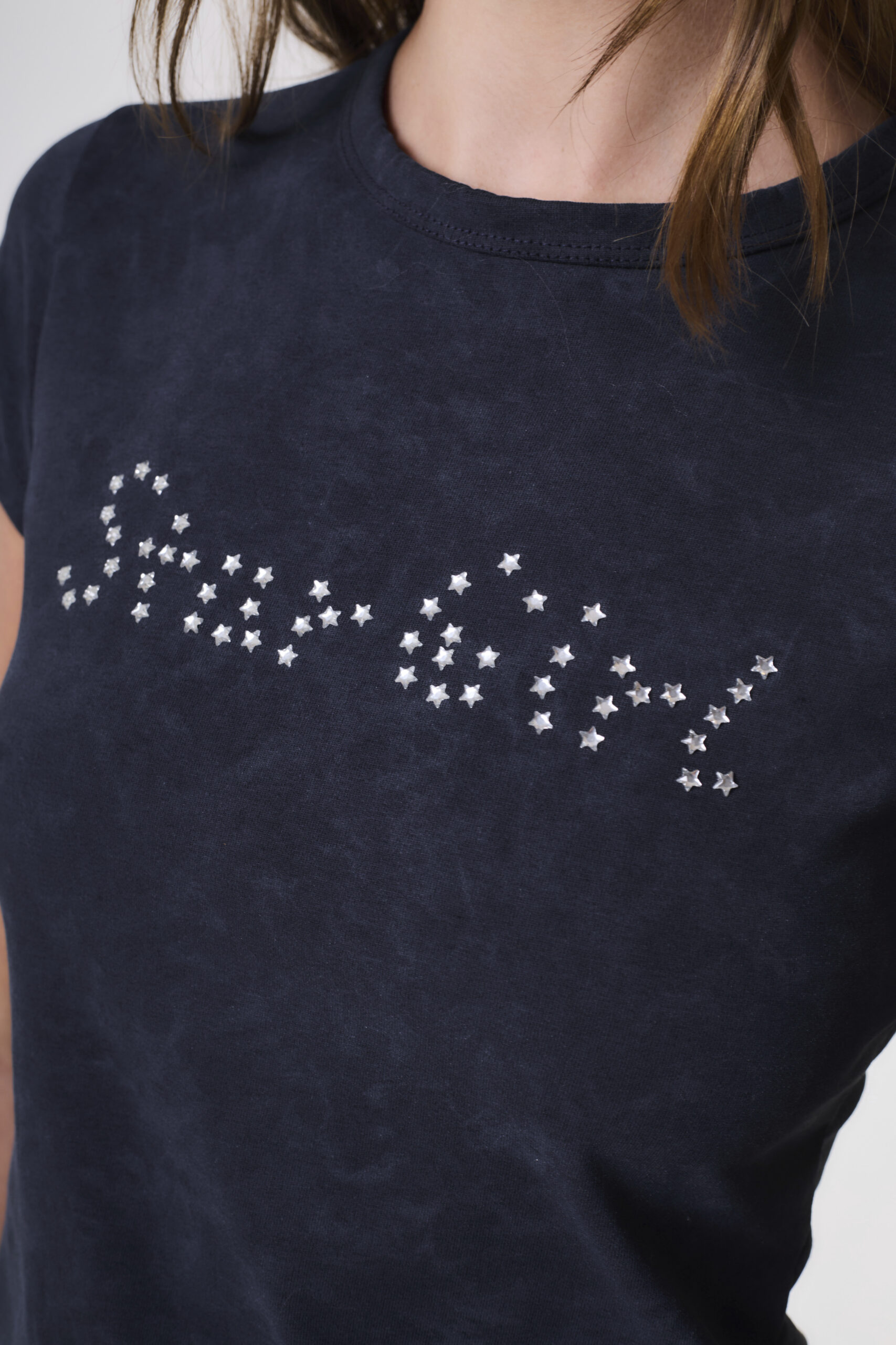 Remera de mujer estilo baby tee manga corta con cuello redondo con terminación en collareta. Posee diseño de hotfix en forma de estrellas en centro delantero. Confeccionado en jersey de algodón.