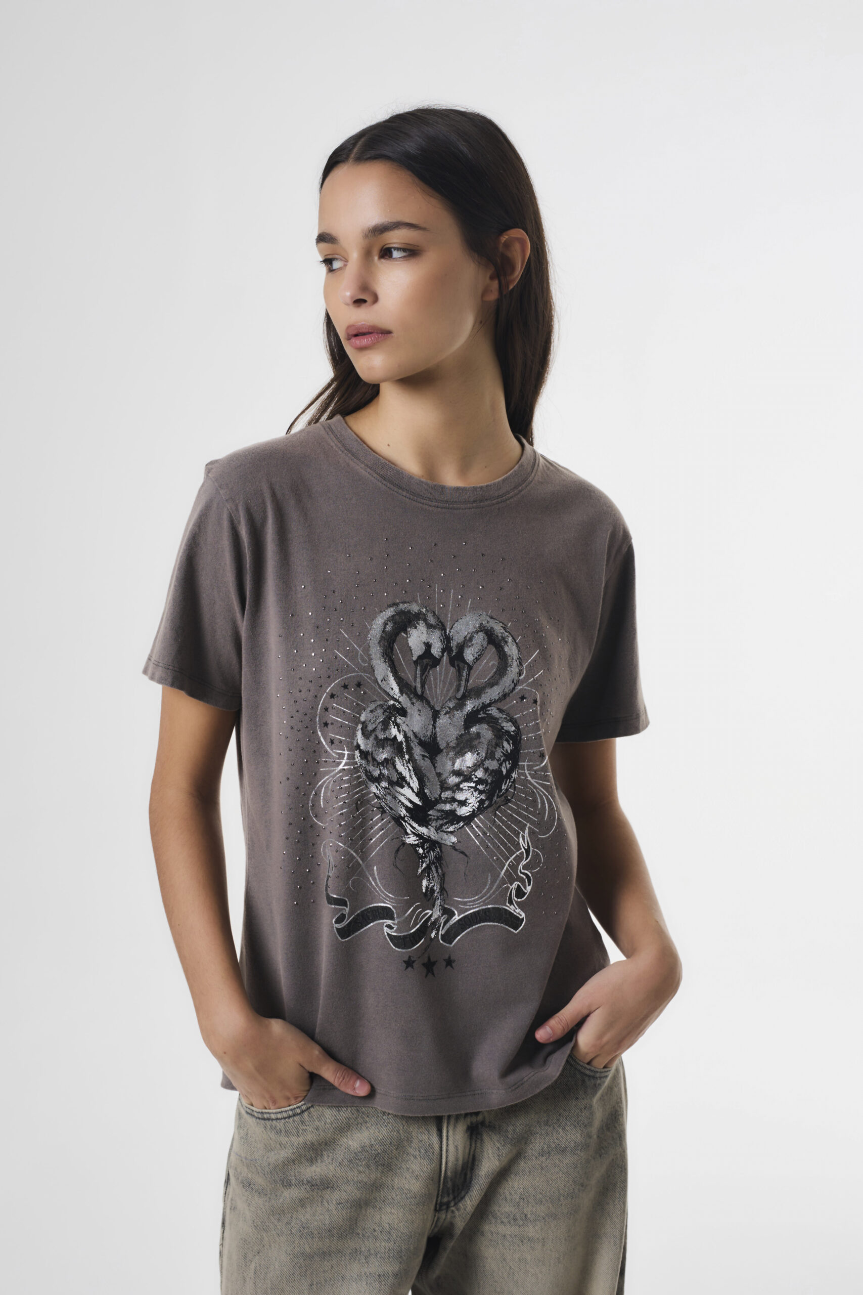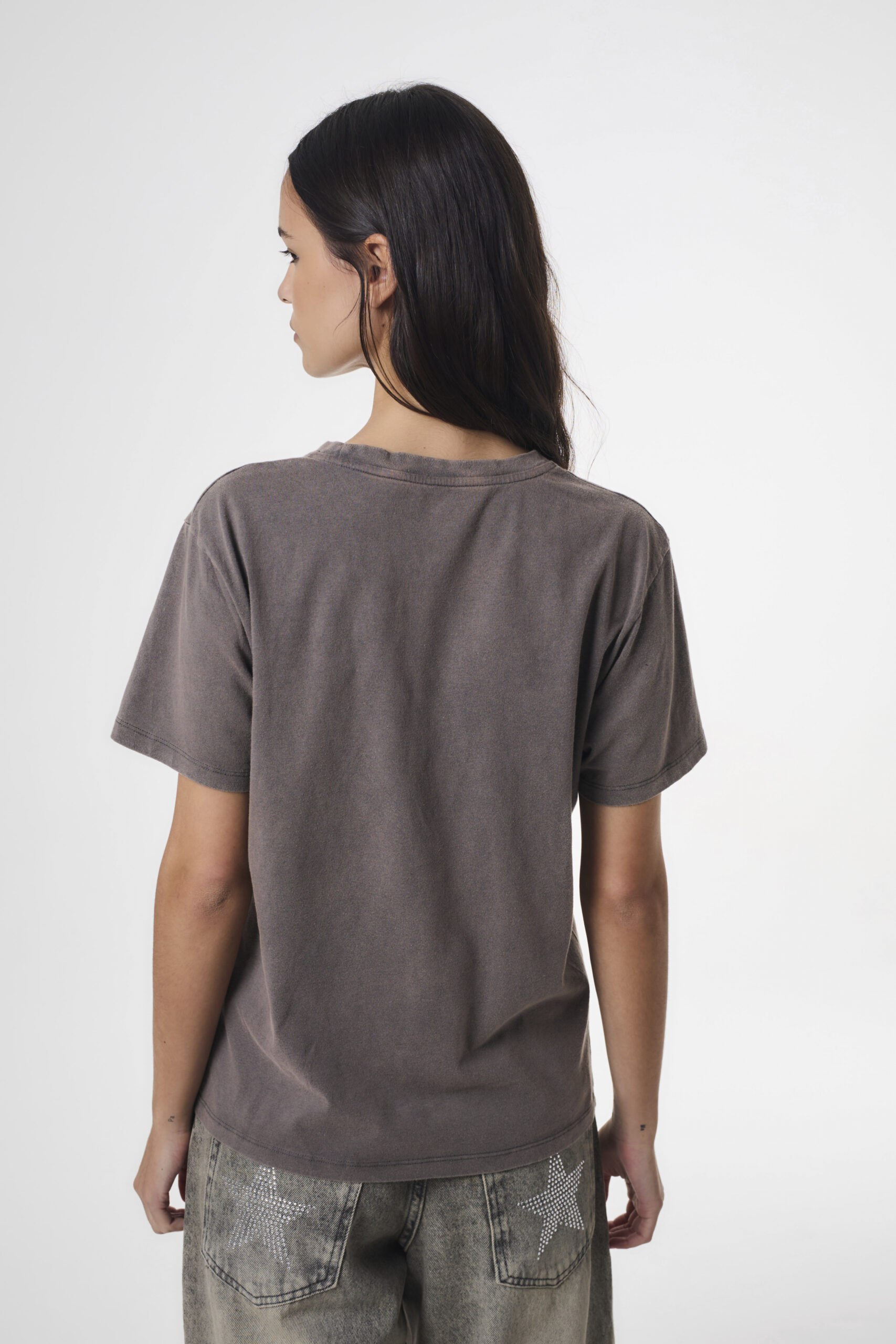 Remera de mujer manga corta de calce oversize con cuello redondo. Además, lleva en el centro delantero una estampa central con hotfix. El diseño de la estampa fué exclusivamente para la colección. También, la remera pasó por un proceso de lavado acid wash. La prenda está confeccionada en jersey de algodón 100%.