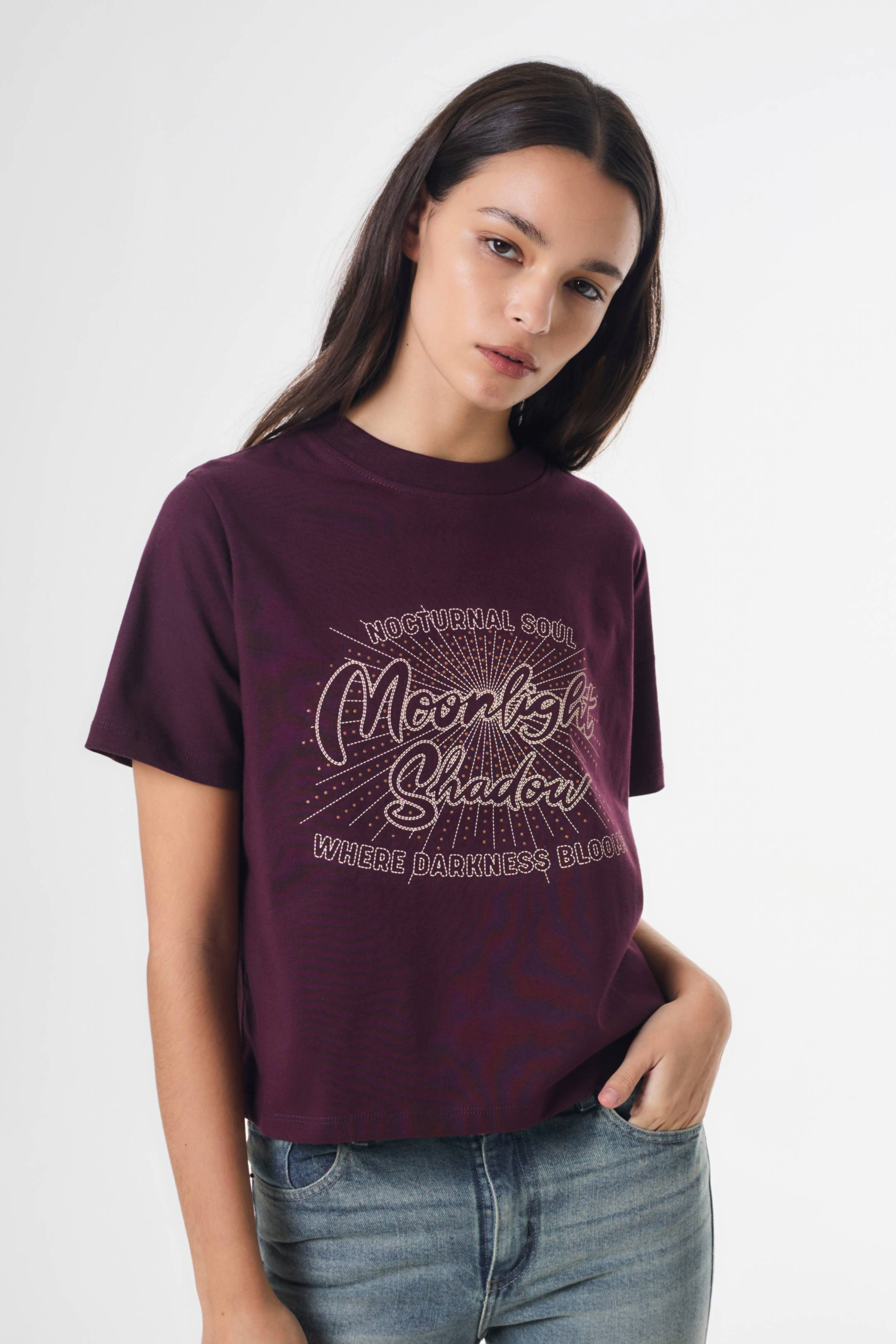 Remera de mujer calce oversize manga corta con cuello redondo. La remera tiene un diseño de estampa en centro delantero exclusivo realizado para la marca con hotifx sobre la estampa. La prenda está confeccionada en jersey de algodón 30/1 con complemento de rib en el cuello.
