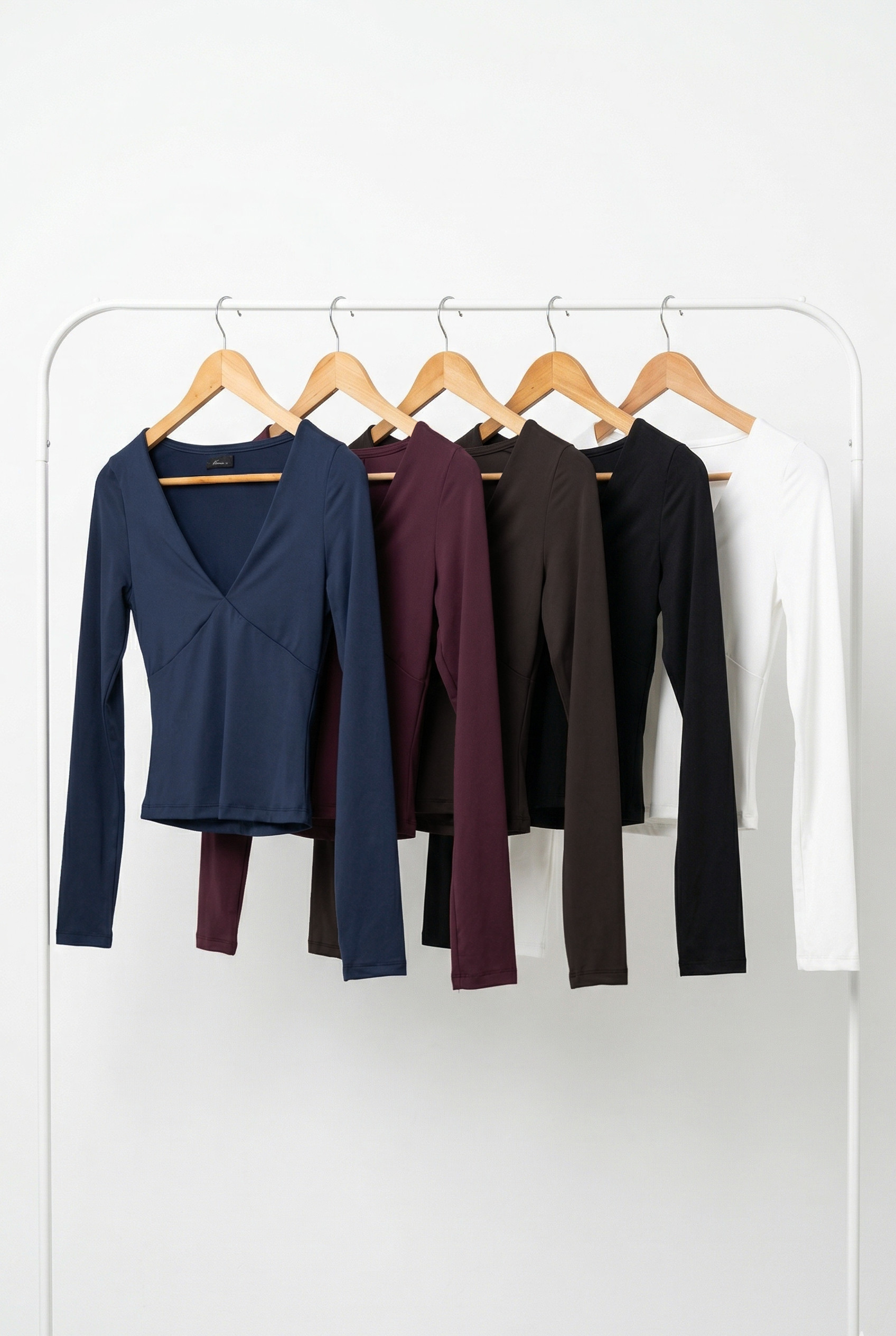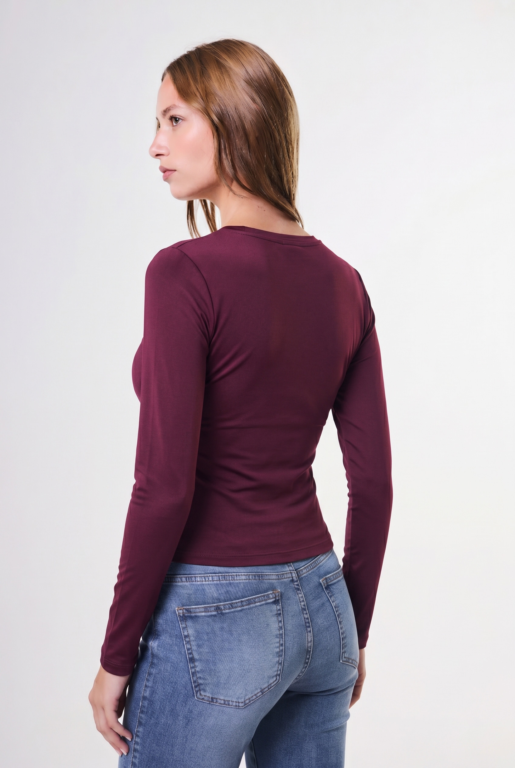 Remera de mujer manga larga de calce adherente con detalle de cuello escote en v y recorte en el busto.