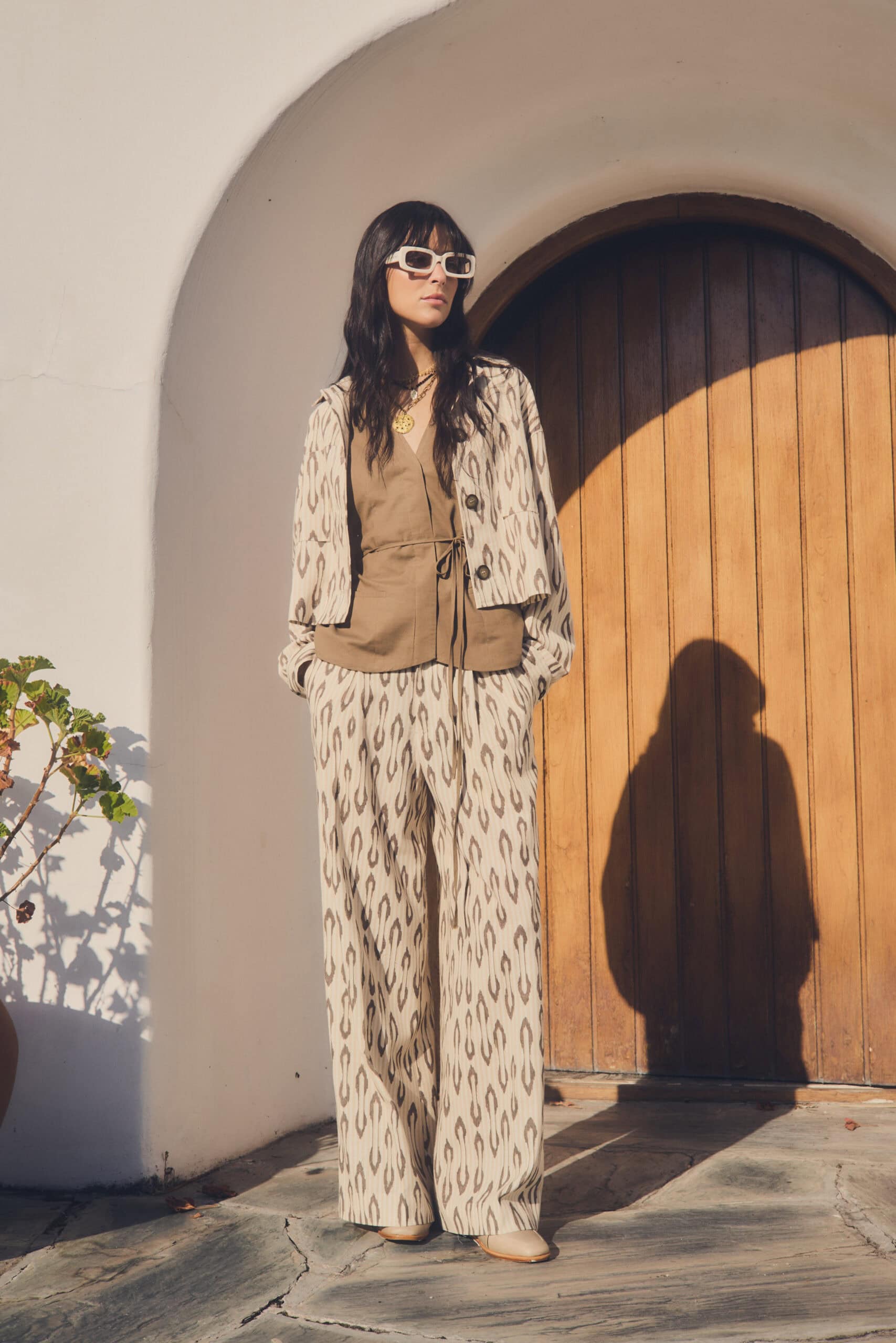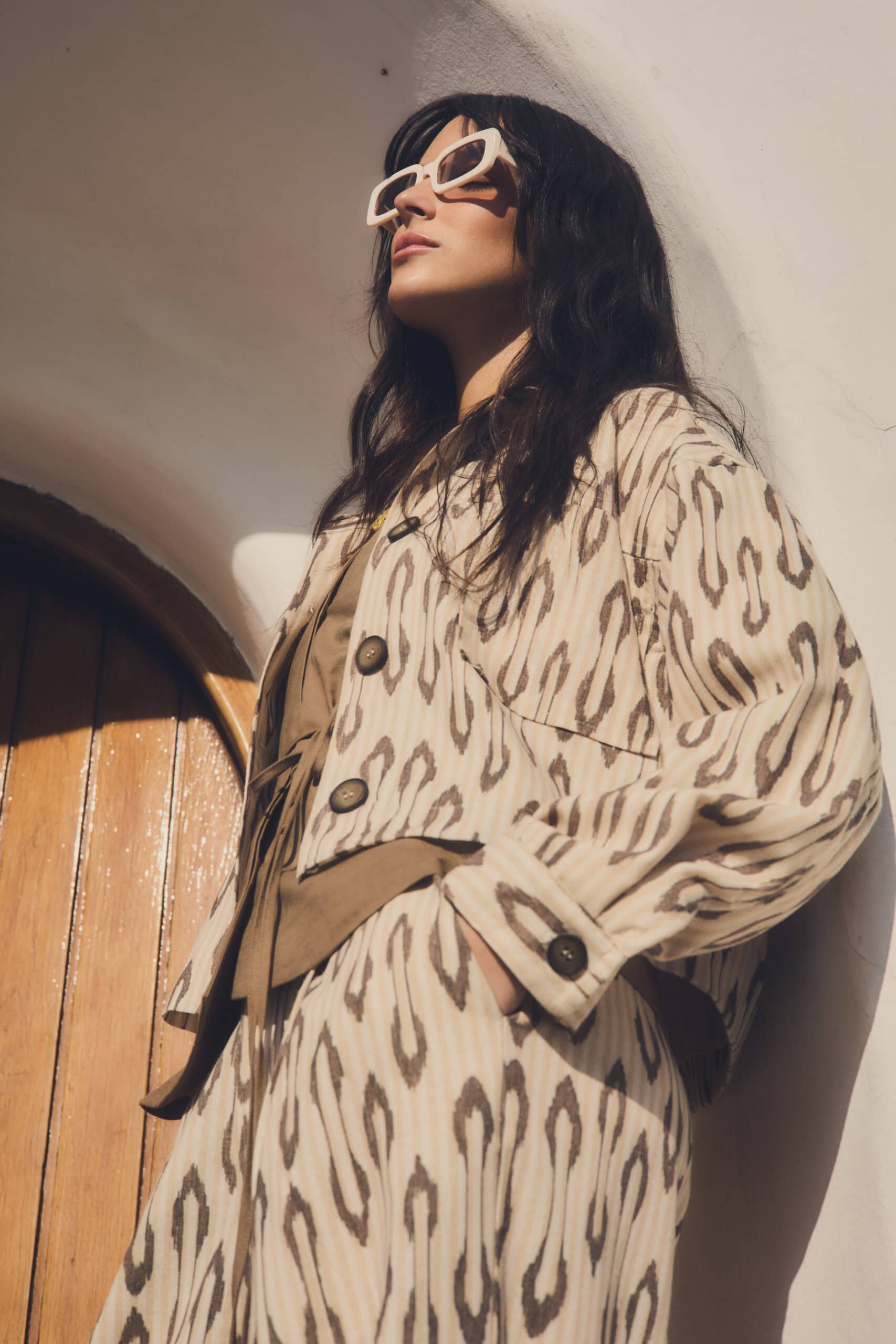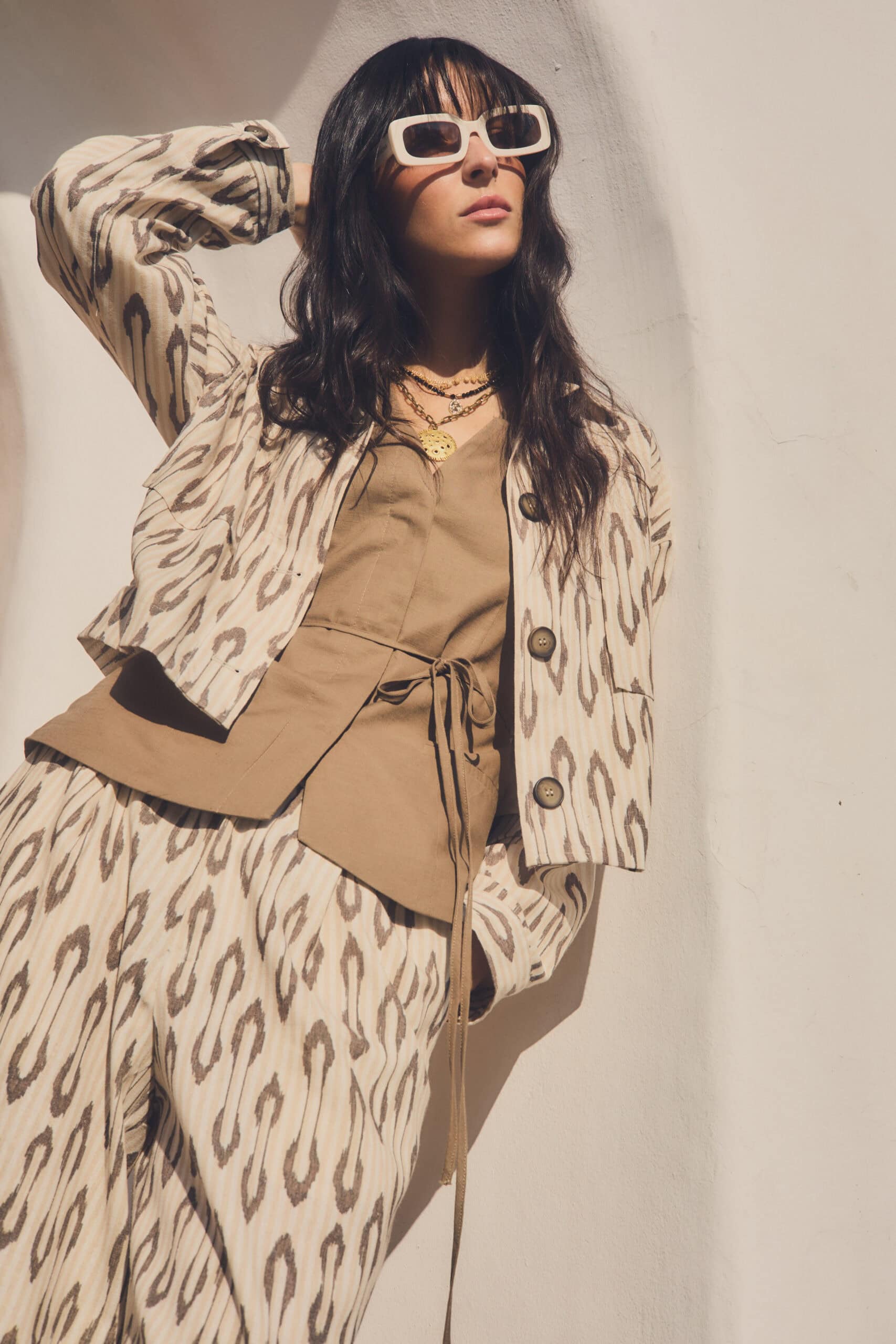 Saco de mujer liviano de lino sublimado con estampa exclusiva de la marca. Lleva cuello y recorte en delantero con bolsillos plaqué. Las mangas llevan puños con apertura y canesú en espalda. La prenda está completamente forrada con voile.