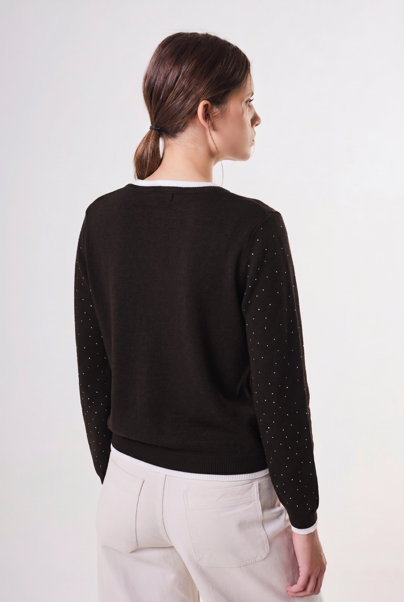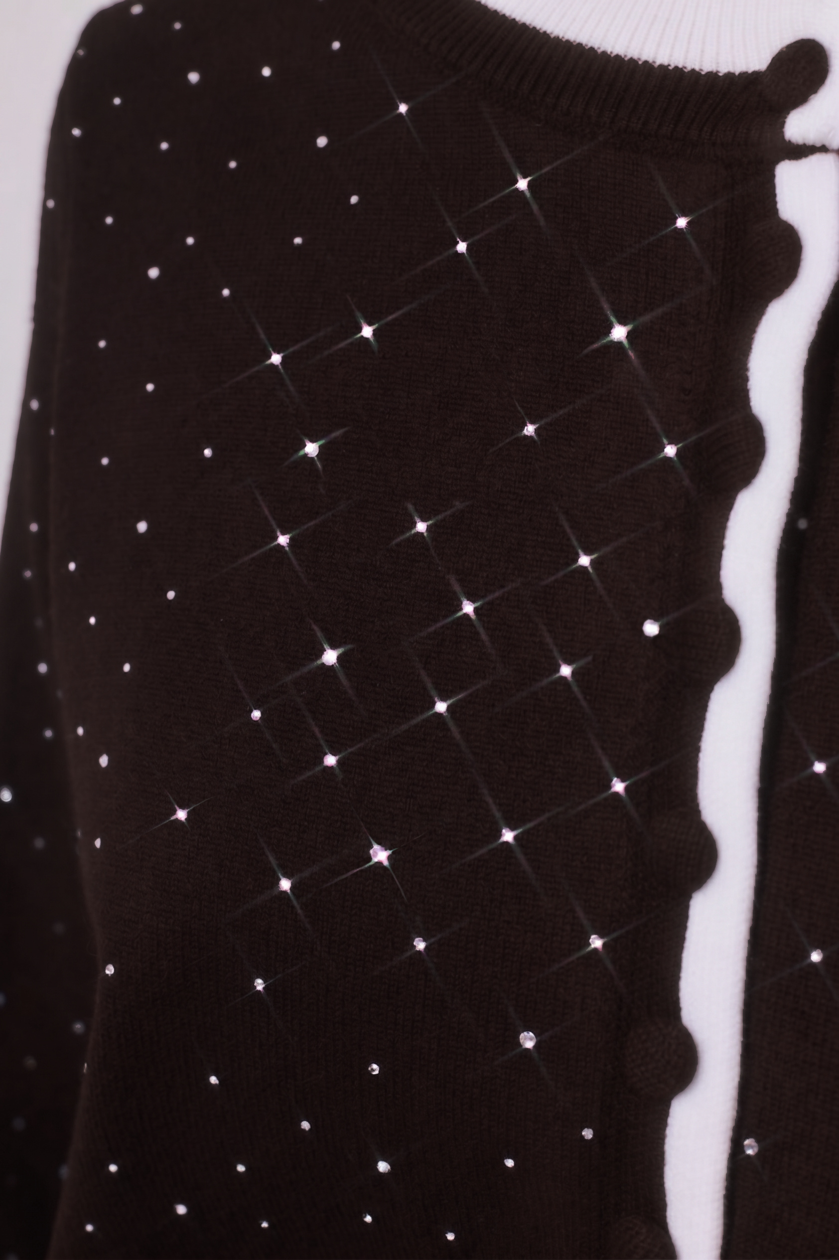 Saco de mujer tipo cardigan de calce recto y largo modular hasta la primera cadera. La prenda posee mangas largas abullonadas y cuello redondo. La prenda se distingue por llevar hotfix strass en todo el delantero y mangas. Además, los puños, cuello, ruedo y cartera de botones están terminadas con […]