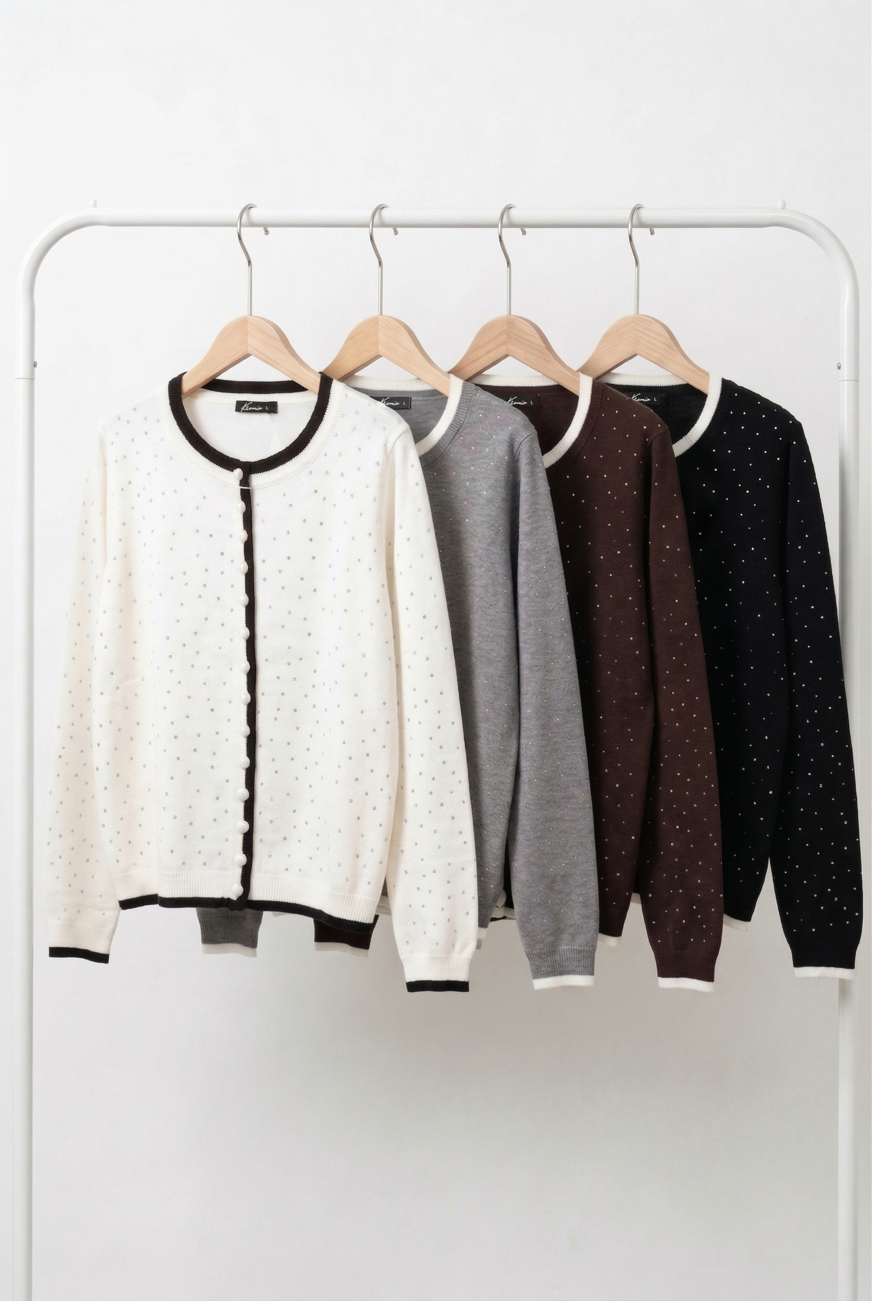 Saco de mujer tipo cardigan de calce recto y largo modular hasta la primera cadera. La prenda posee mangas largas abullonadas y cuello redondo. La prenda se distingue por llevar hotfix strass en todo el delantero y mangas. Además, los puños, cuello, ruedo y cartera de botones están terminadas con un hilado a contratono. Se concede acceso a la prenda mediante botones de pie forrados al tono. El saco está confeccionado en un tejido tipo bremer peach.