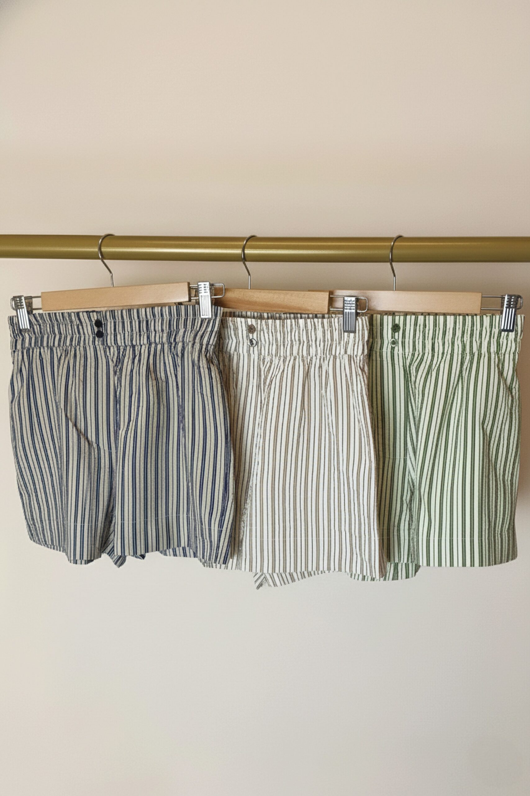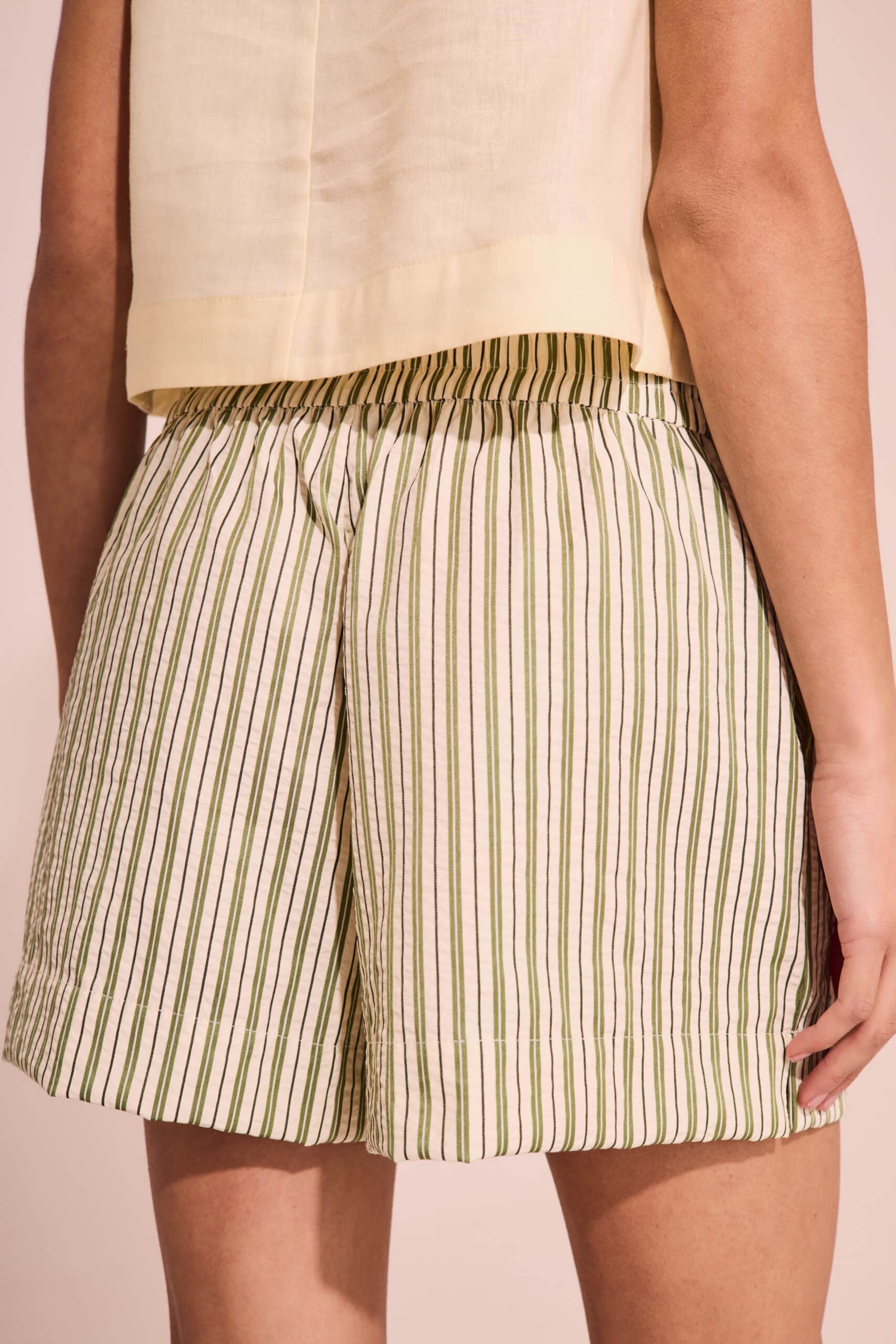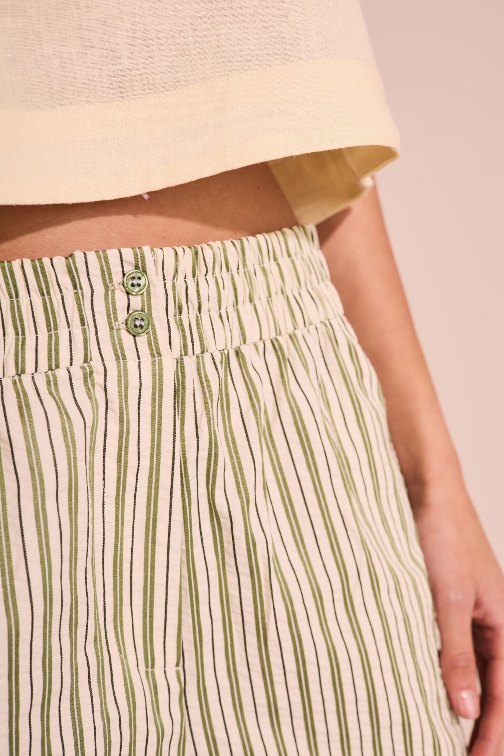 Short de mujer estilo comfy de calce holgado con cintura elástica, con botones en cintura, bolsillos laterales . Lleva zócalo ancho en ruedo y tajos en laterales. Confeccionado en poplin rayado diferenciado.