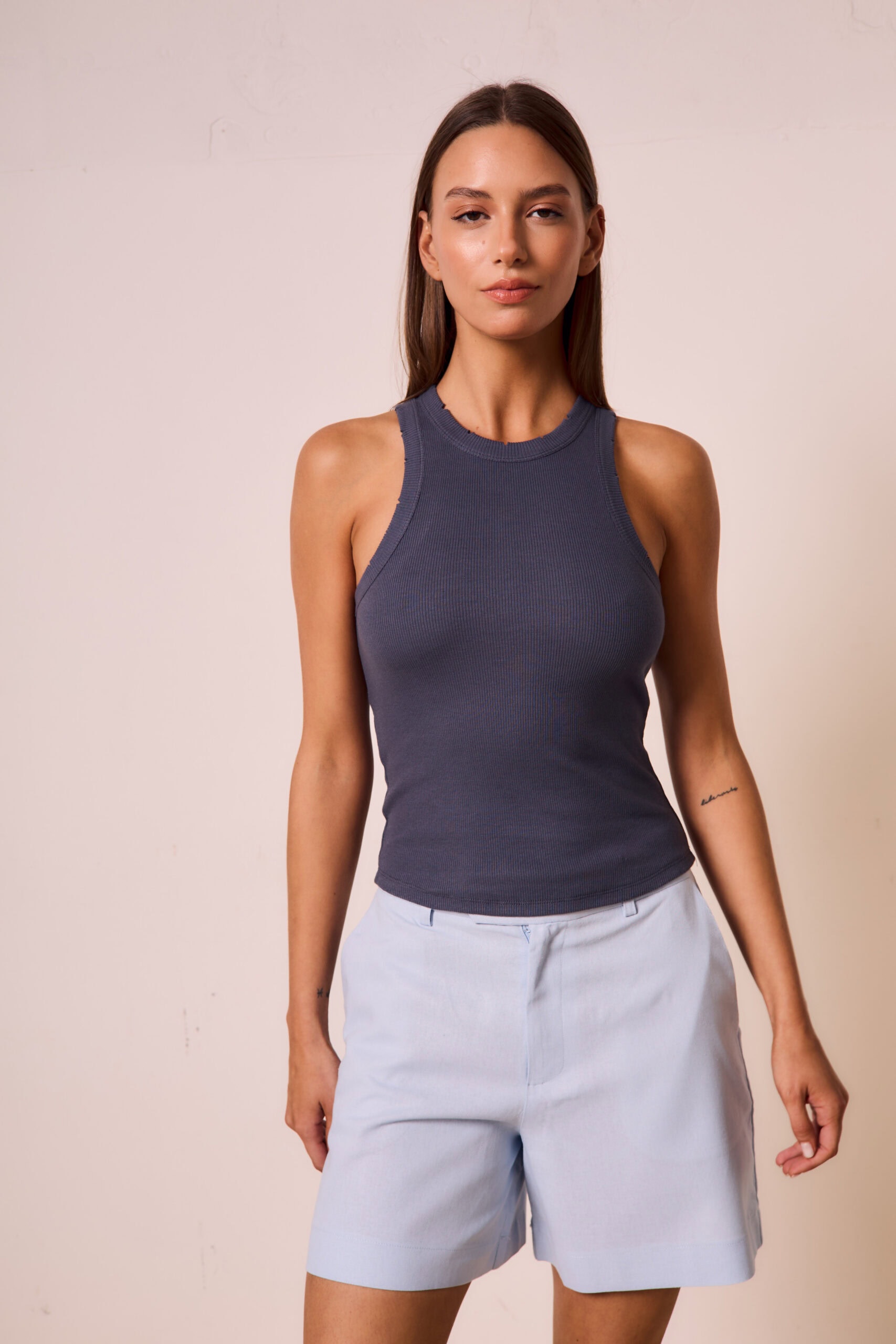 Short de mujer tiro medio de pierna recta, con bolsillos laterales y ribete con ojal en espalda. Detalle de cintura cruzada con botón. Confeccionada en lino.