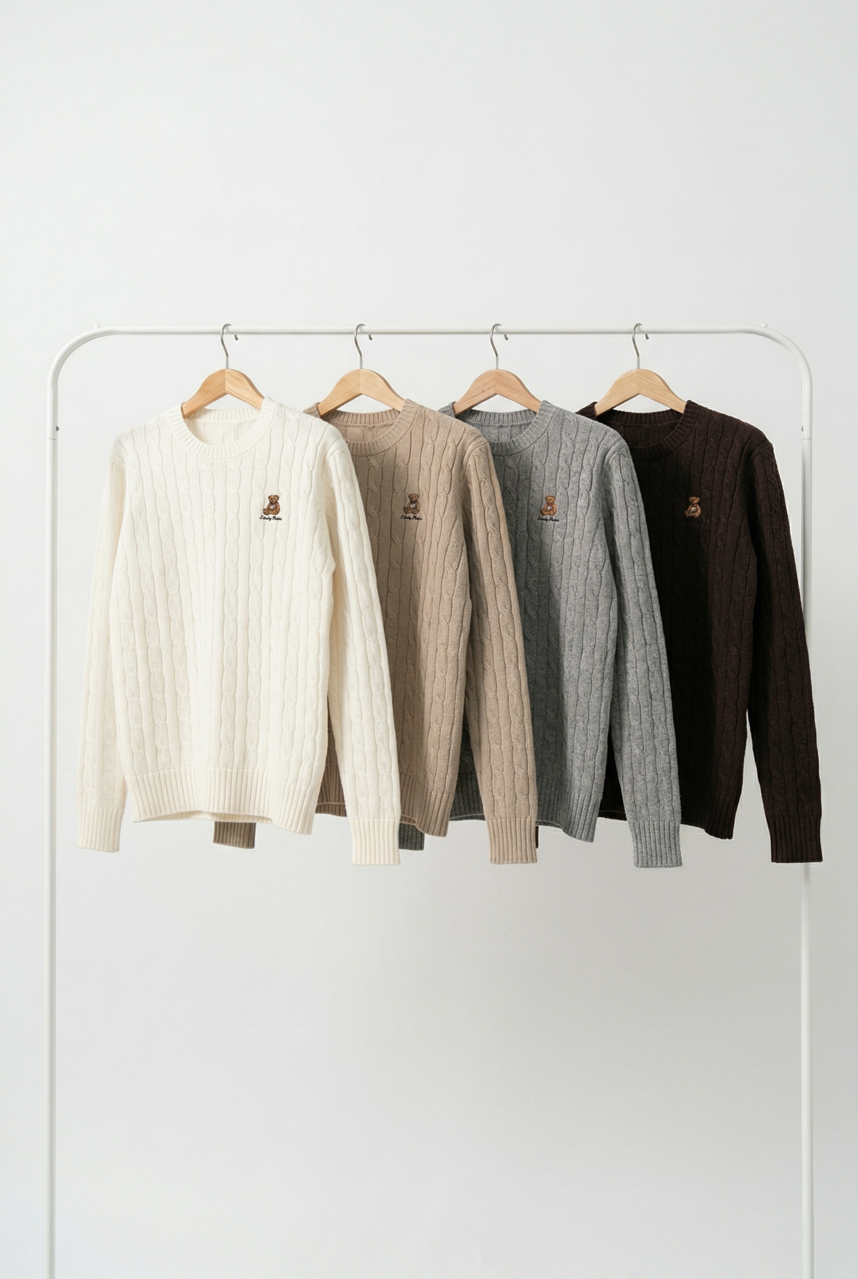 Sweater de mujer de calce recto con largo modular hasta la segunda cadera. La prenda lleva mangas largas y cuello redondo. El sweater se caracteriza por llevar bordado en el lateral delantero un oso. Además, la prenda está confeccionada en un tejido trenzado diferenciado con terminaciones de punto rib en puños, cuello y pretina.