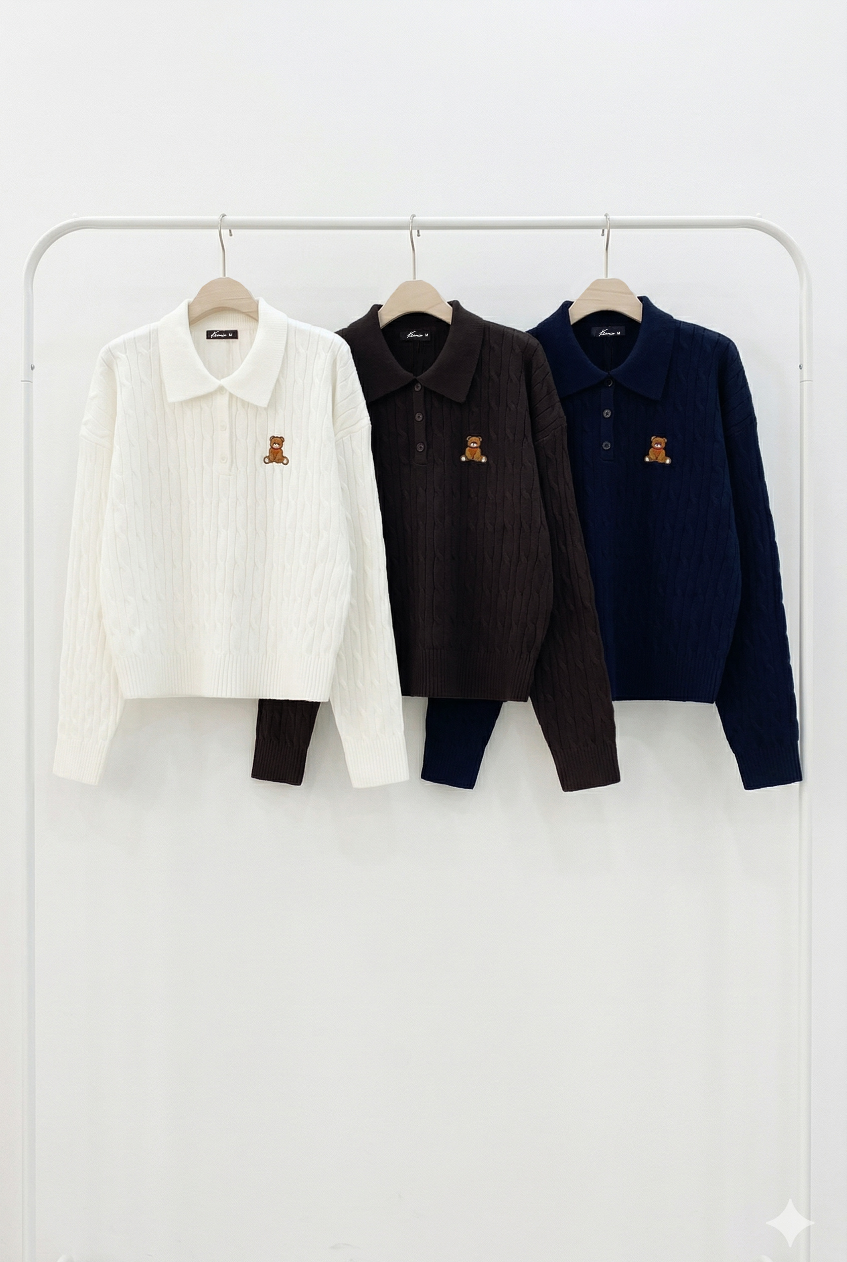 Sweater importado con cuello chomba y bordado de oso con moño en el delantero.