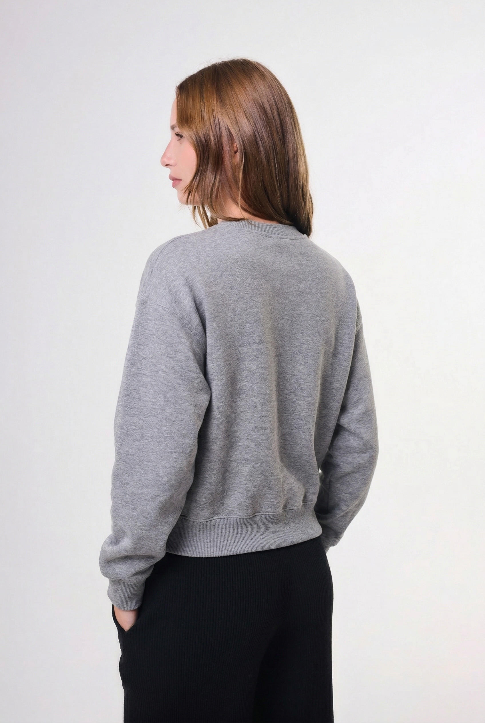 Sweater de mujer de calce holgado con largo modular hasta la primera cadera. La prenda es simple, con cuello redondo y mangas largas abullonadas. Además, la prenda está confeccionada en hilado pesado en punto jersey, con las terminaciones de los puños, cuello y pretina en punto rib.