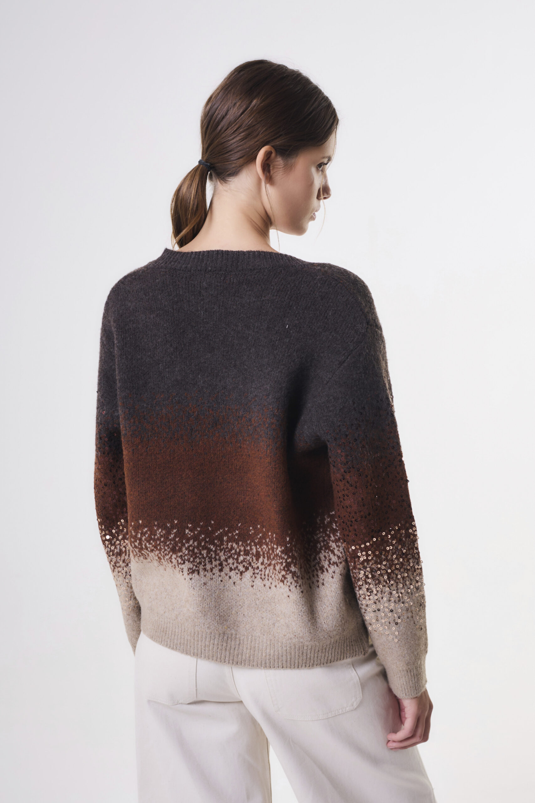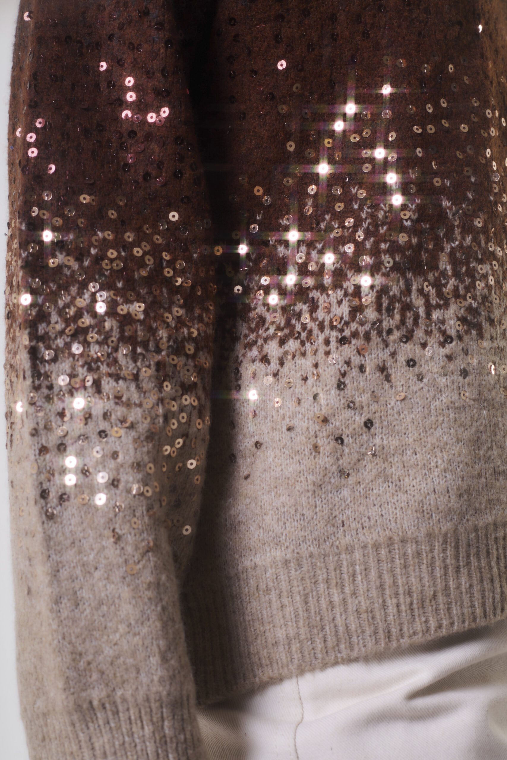 Sweater de mujer importado de calce holgado con largo modular hasta la segunda cadera. La prenda se destaca por estar confeccionadas en un punto jersey con jacquard. El diseño consiste en un degradé de tres colores, con lentejuelas doradas que acompañan el degradé en el delantero y las mangas. Los puños, cuello y pretina llevan punto rib.