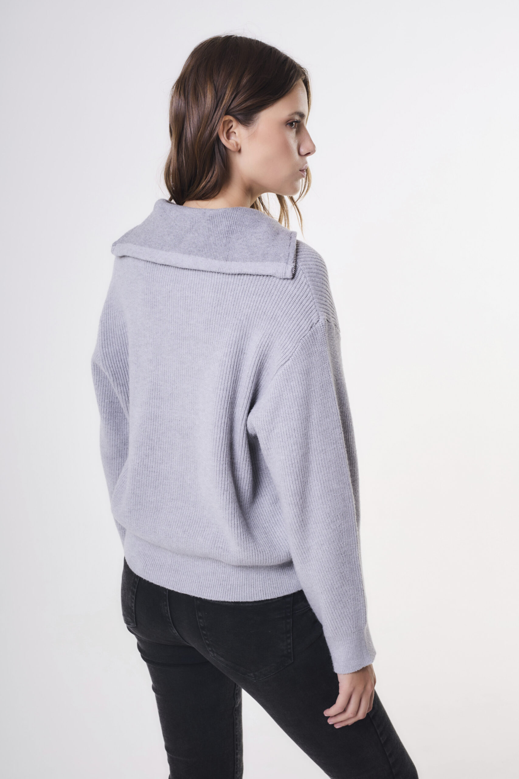 Sweater de mujer importado calce holgado con largo modular hasta la segunda cadera. Lleva cuello polo XL y cierre metálico que se extiende hasta la altura del busto. La prenda está confeccionada en punto jersey con las terminaciones en puños, pretina y cuello en punto rib. Composición: 50% Viscosa 28% Poliéster 22% Nylon.