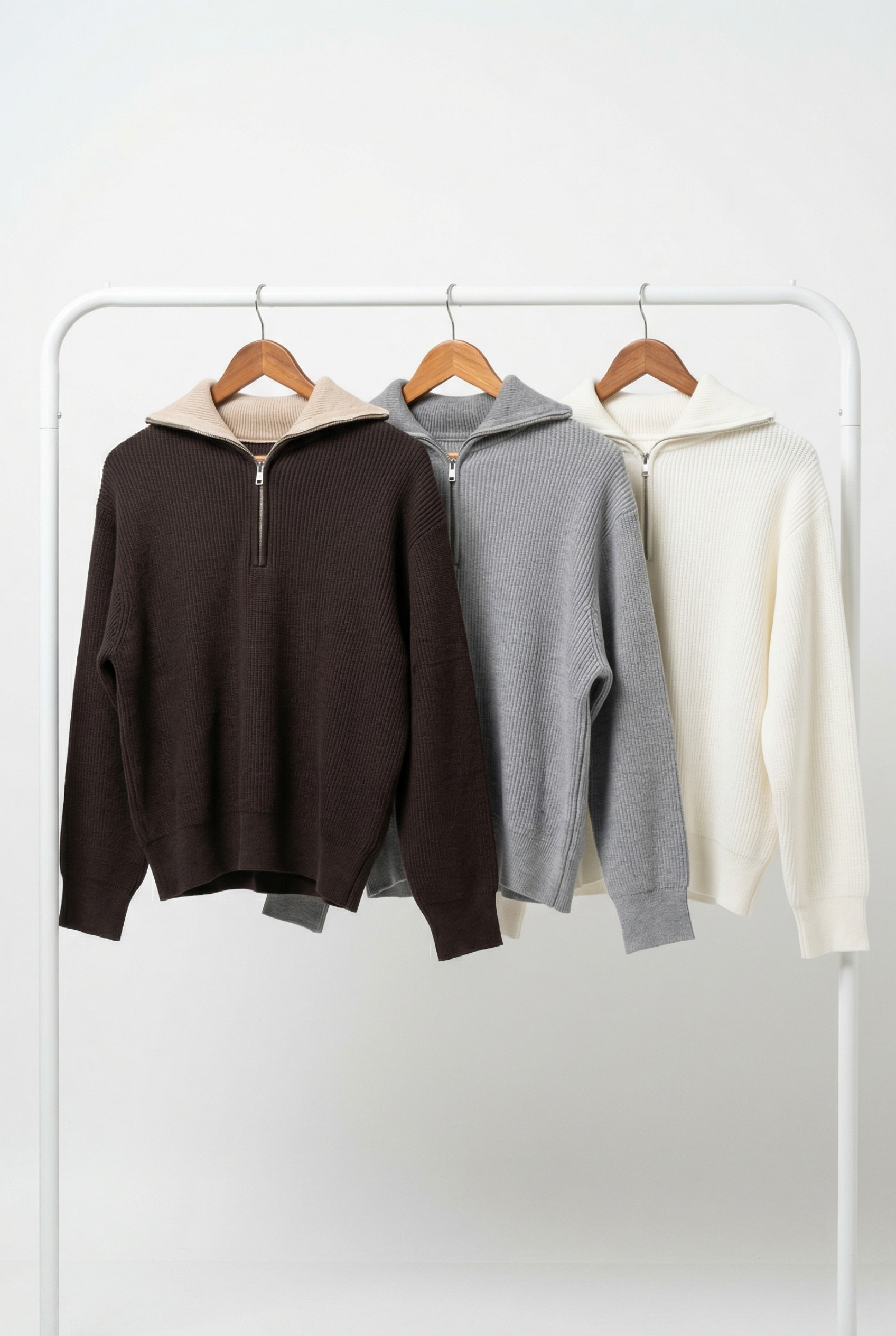 Sweater de mujer importado calce holgado con largo modular hasta la segunda cadera. Lleva cuello polo XL y cierre metálico que se extiende hasta la altura del busto. La prenda está confeccionada en punto jersey con las terminaciones en puños, pretina y cuello en punto rib.