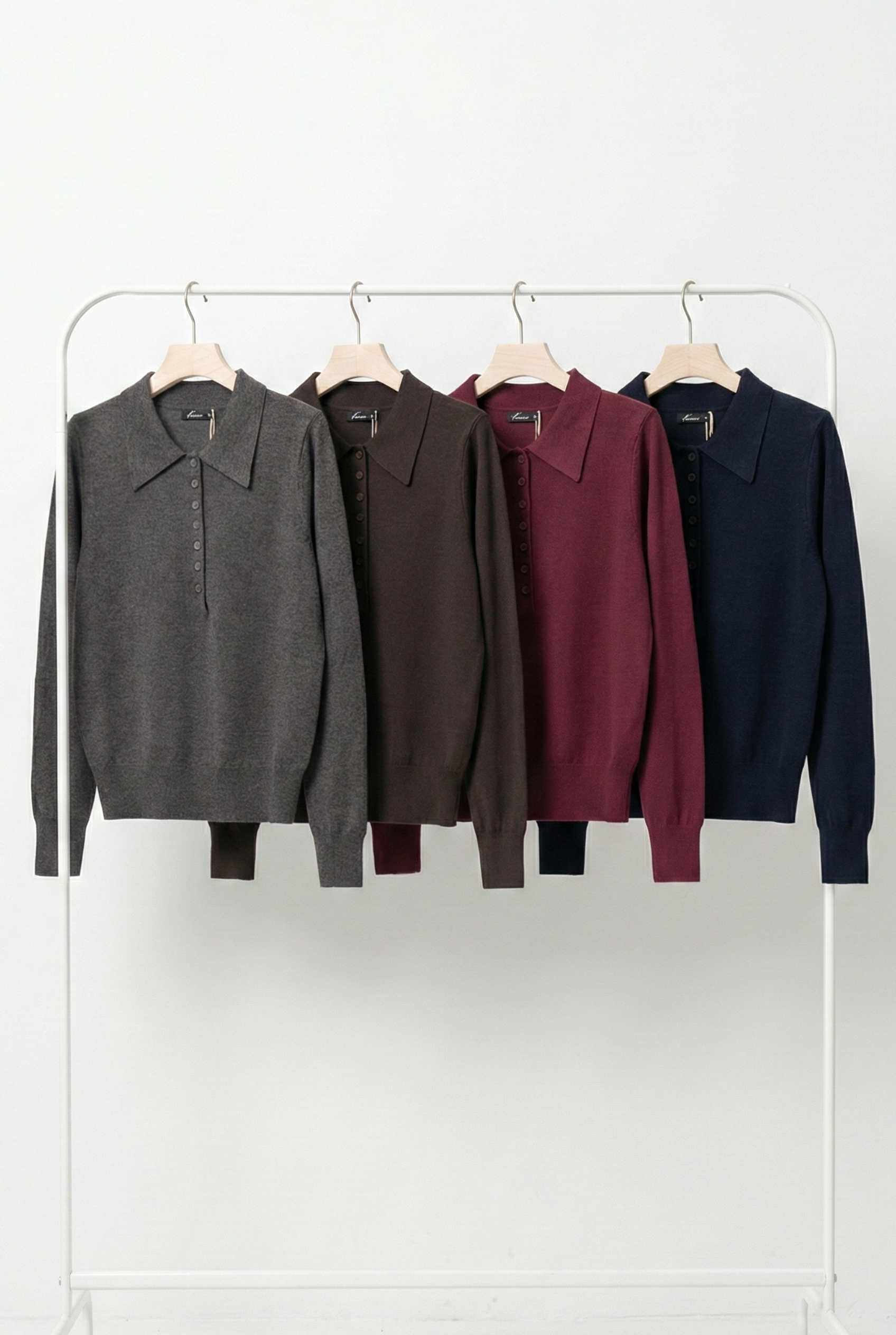 Sweater de mujer importado básico manga larga, largo modular hasta primera cadera con un leve entalle en terminaciones acanalado, con cuello solapa clásico similar a polos cuenta con una tapa frontal a lo largo del pecho con pequeños botones al tono. Está confeccionado en tela de punto material blends.