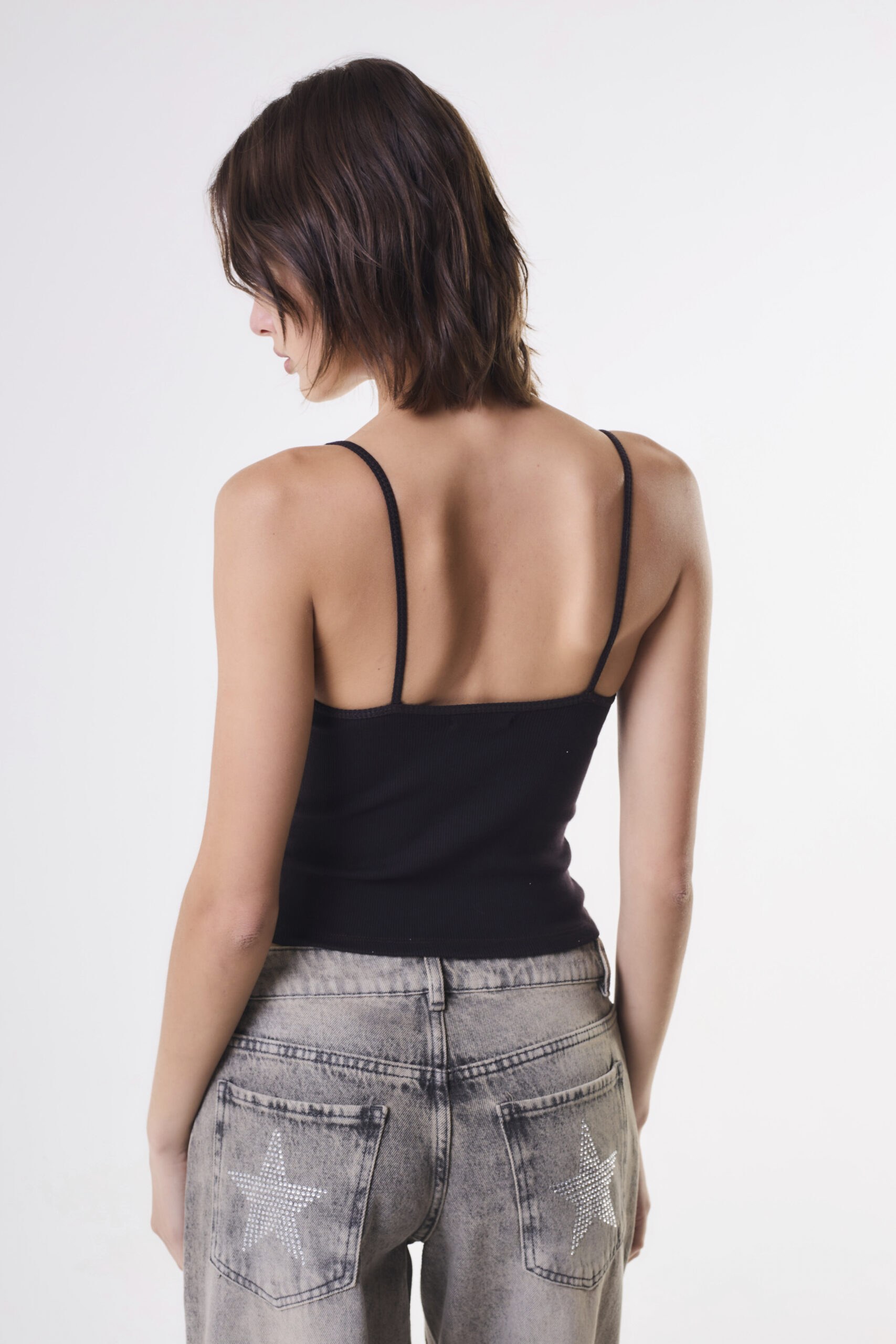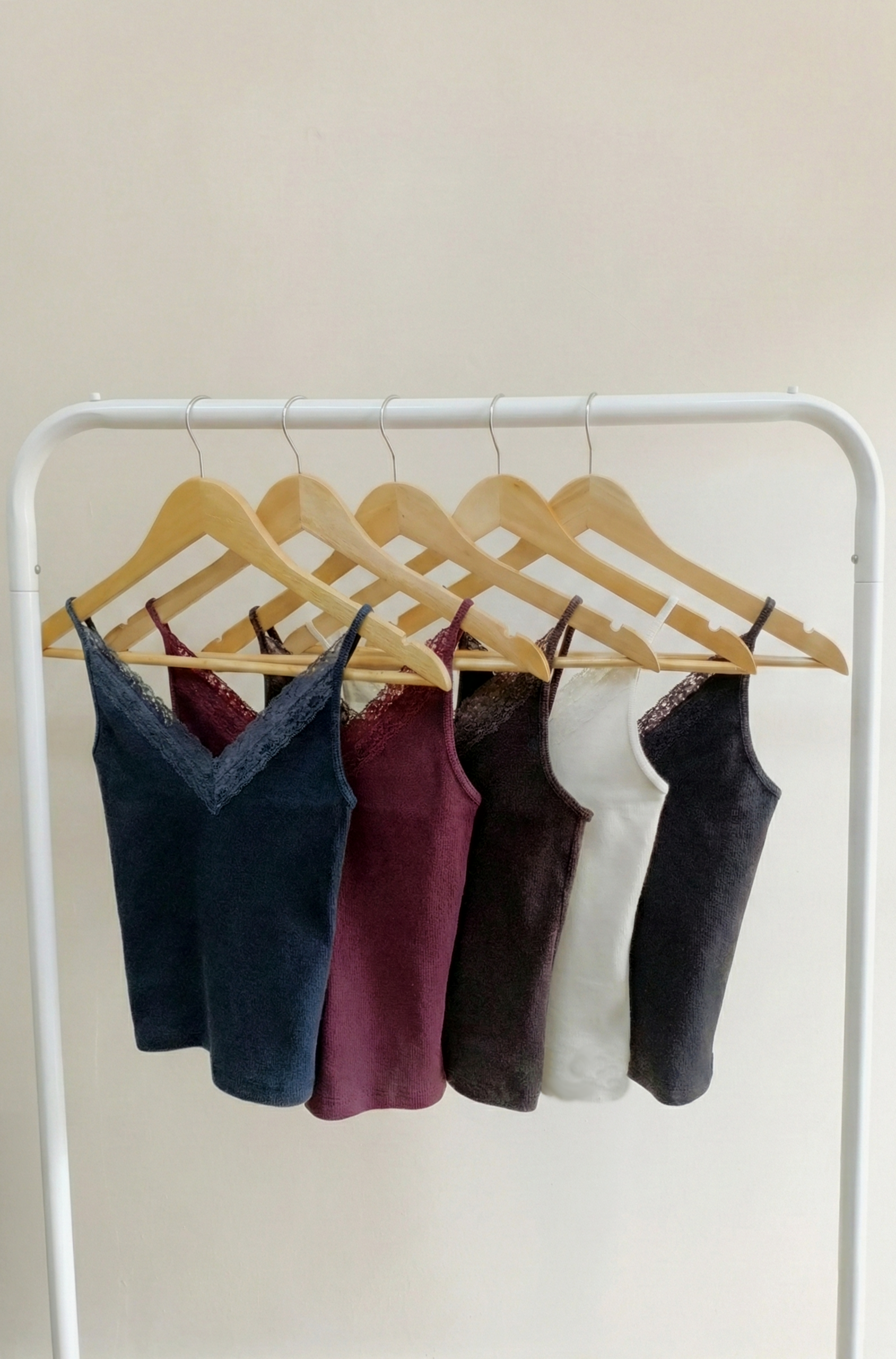 Musculosa de mujer de calce adherente con largo modular hasta primera cadera. Lleva breteles regulables y escote en V con puntilla de encaje al tono que recorre el escote. Confecionado en morley de algodón.