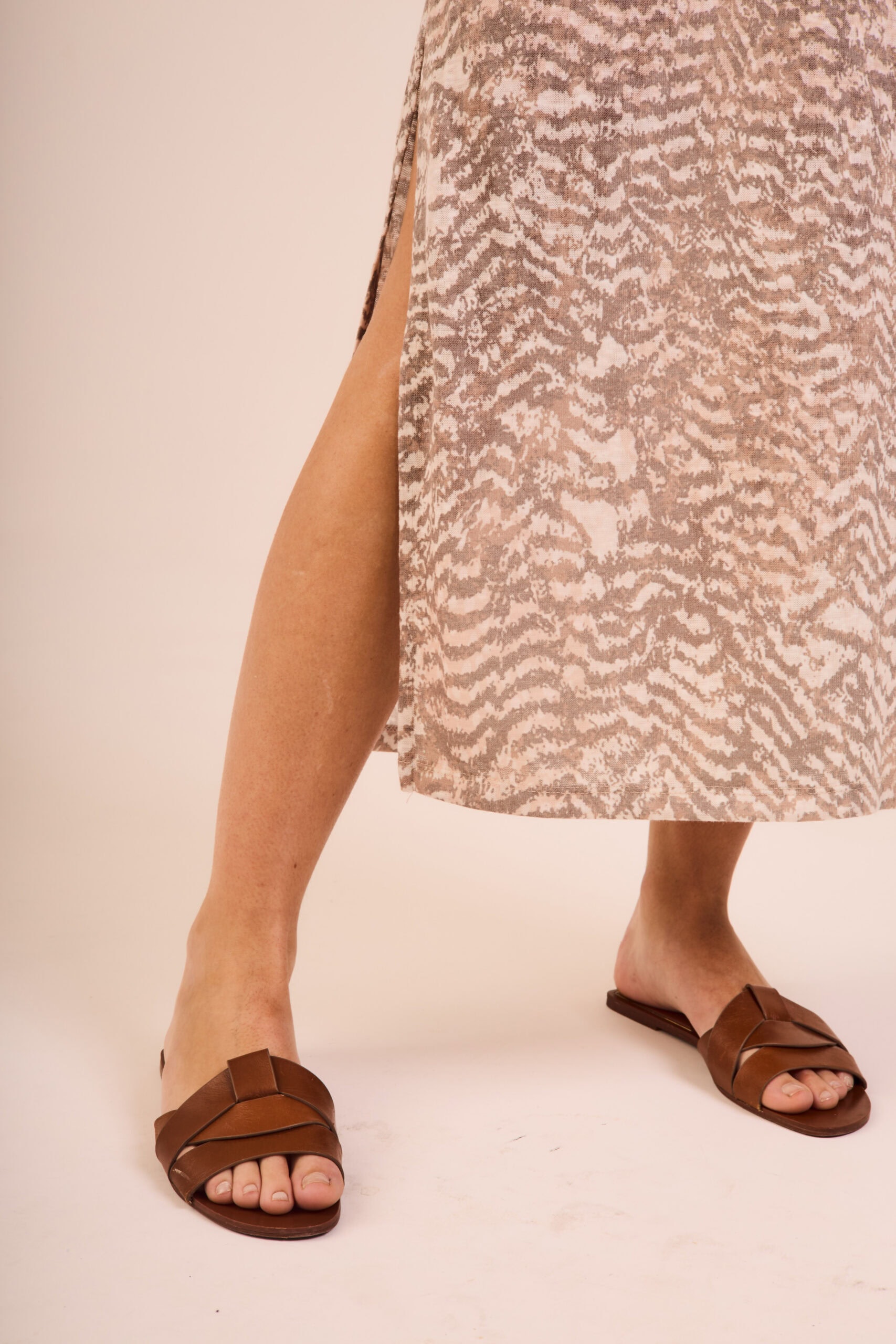 Vestido de mujer de calce evasé y largo modular midi. Lleva escote halter con tira regulable para atar detrás del cuello. Posee tajos en laterales y espalda semiabierta. Confeccionado en jersey sublimado con estampa exclusiva de la marca.