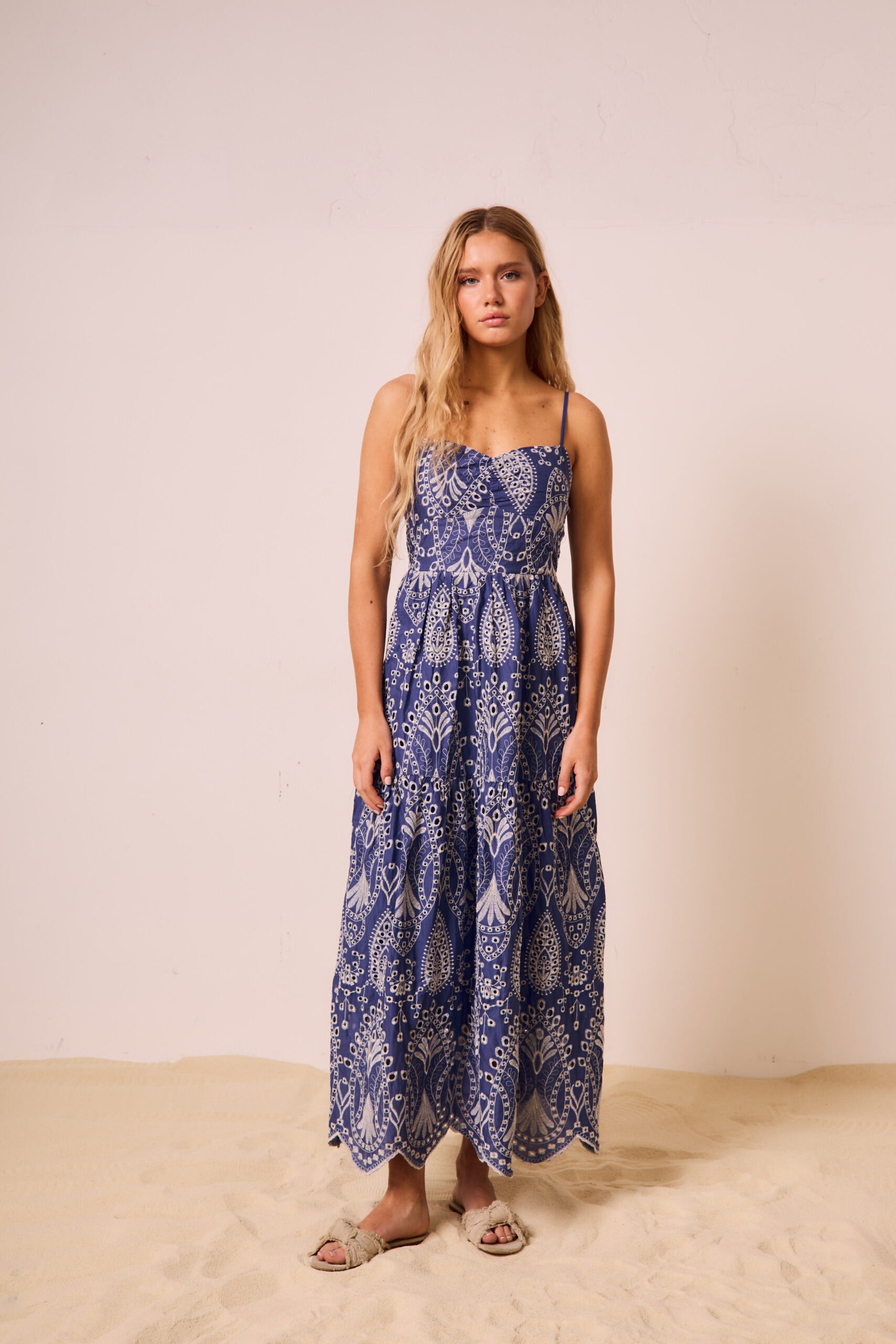 Vestido importado de mujer de calce evasé. Lleva escote corazón, recorte en cintura y en la falda. Posee espalda elástica y breteles regulables. Largo modular maxi. Confeccionado en voile de algodón con bordados y calados a contratono. Forrado con voile.