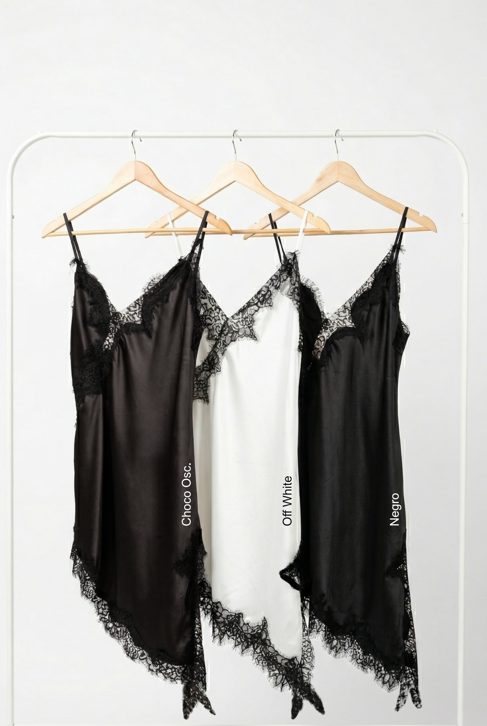 Vestido de mujer importdo de calce evasé con breteles finos regulables y escote en V. La prenda se destaca porque tiene un recorte asimétrico que recorre el delantero, con una puntilla sobre el recorte. Está puntilla también acompaña el escote delantero y de espalda. La prenda es asimétrica, con el largo modular midi. También, la puntilla se encuentra en todo el ruedo, generando un volado caracol en el final de la prenda. El vestido lleva un tajo en el lateral más largo. La prenda está confeccionada en un sartén pesado.