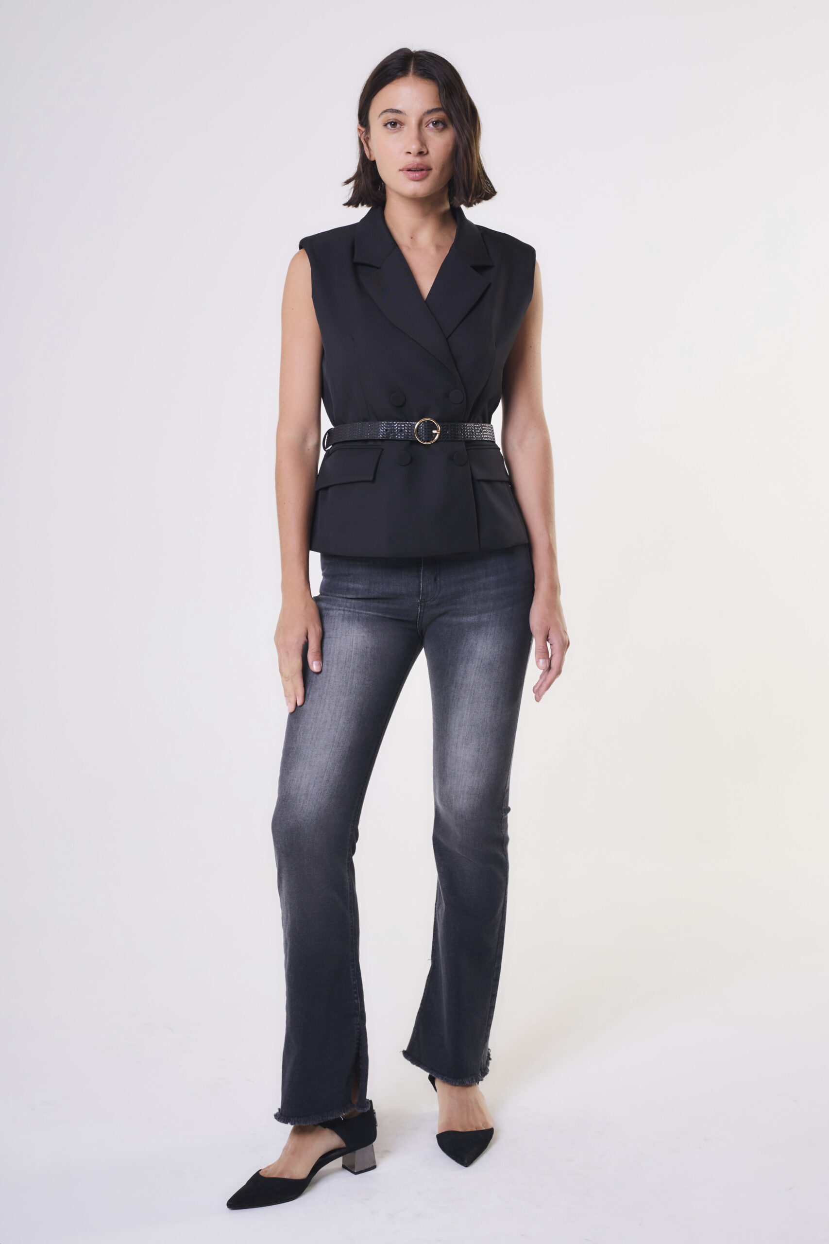 $ 30.000,00Pantalón de mujer tiro medio corford slim fit con tajos laterales.