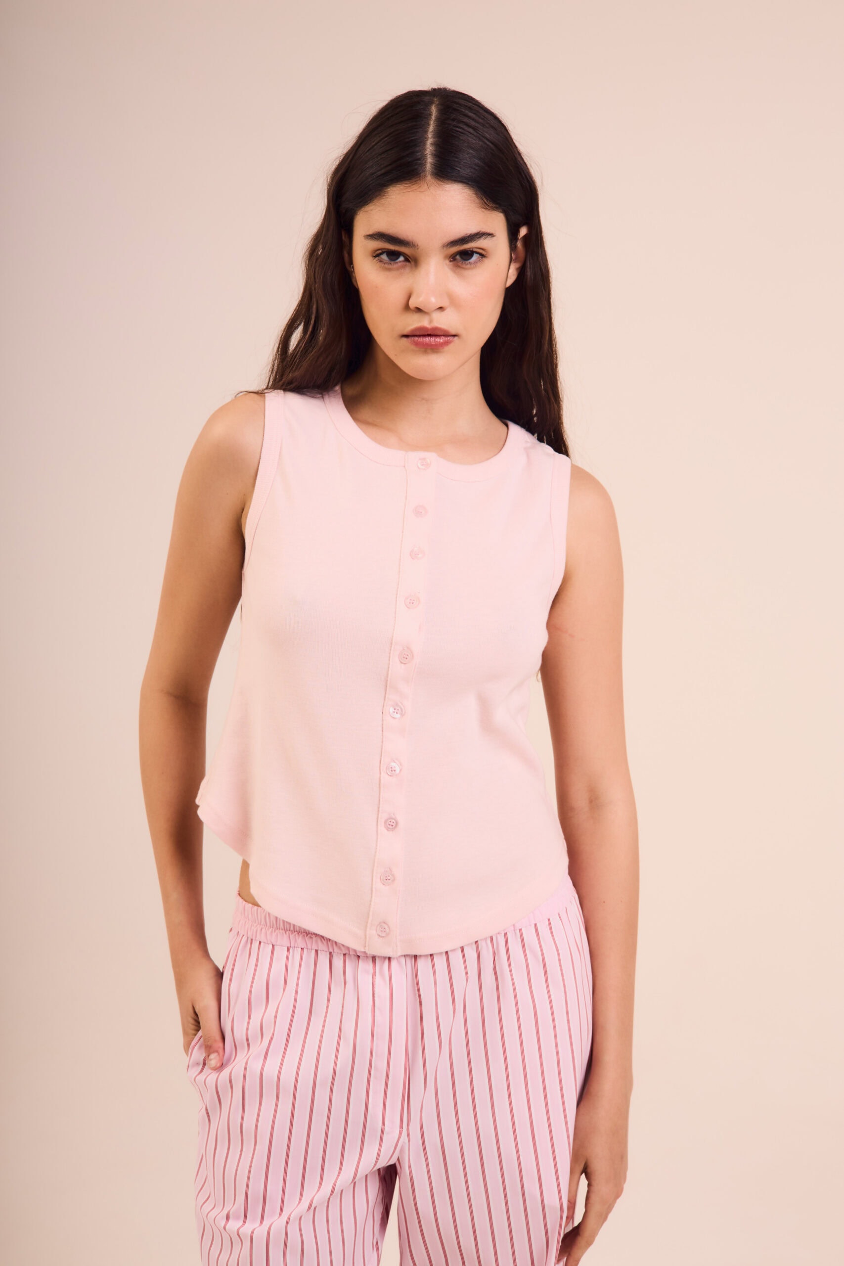 $ 12.000,00Musculosa de mujer de escote redondo cerrado y collareta ancha con acceso por botones camiseros al tono.