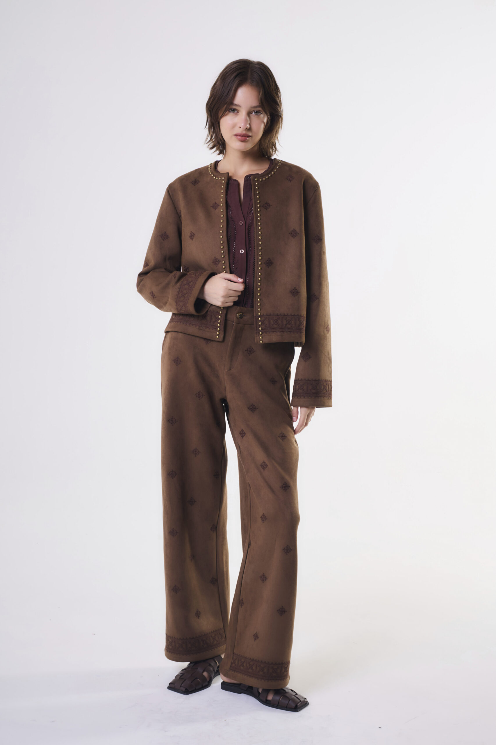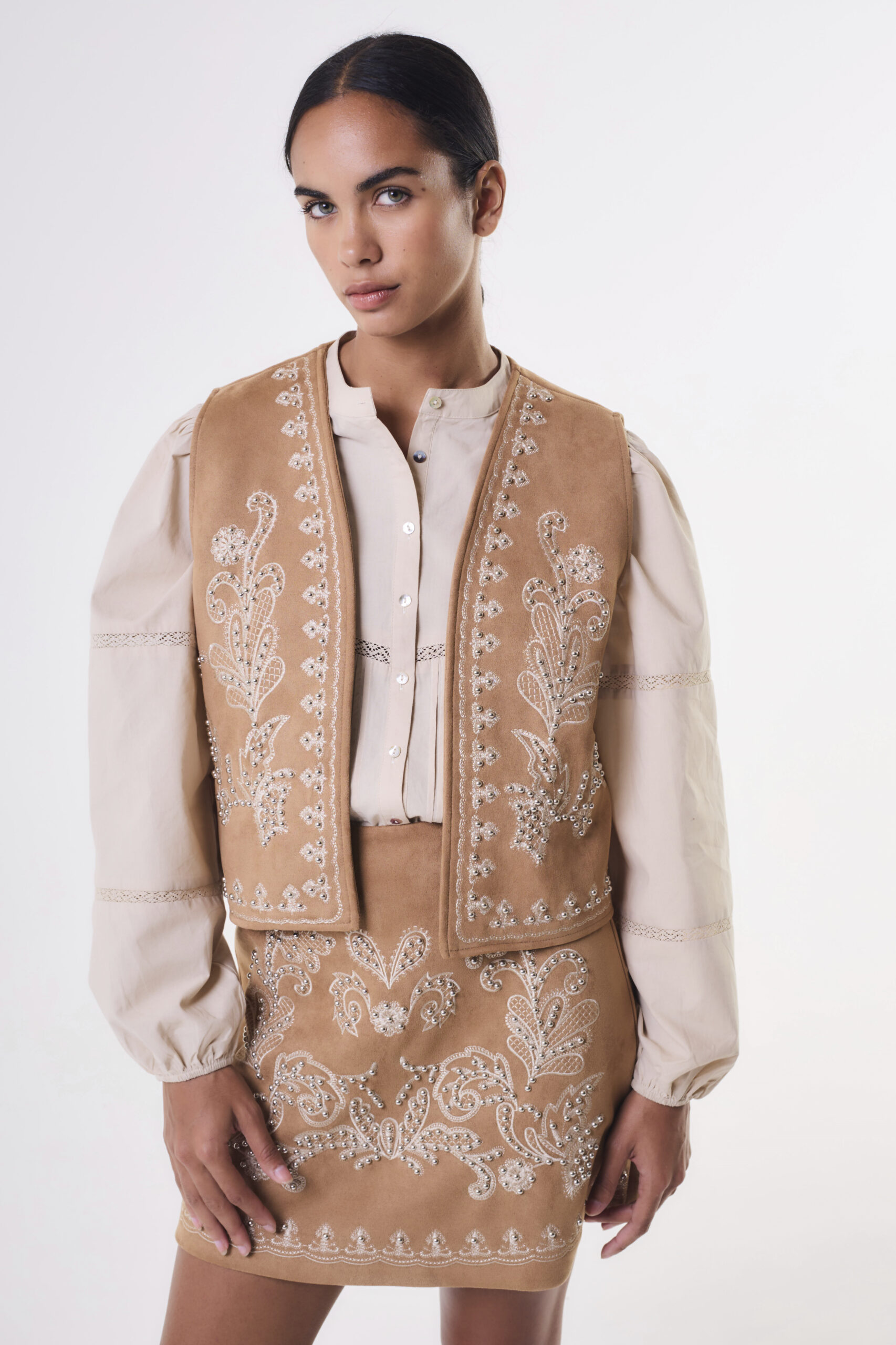 New$ 25.000,00Pollera de mujer importado tiro alto de calce evasé, de largo modular mini. La prenda tiene un diseño abstracto bordado en el delantero, además, tiene un diseño de tachas bombé niqueladas sobre el bordado. El bordado y las tachas también recorren el ruedo delantero. La prenda está confeccionada en un […]