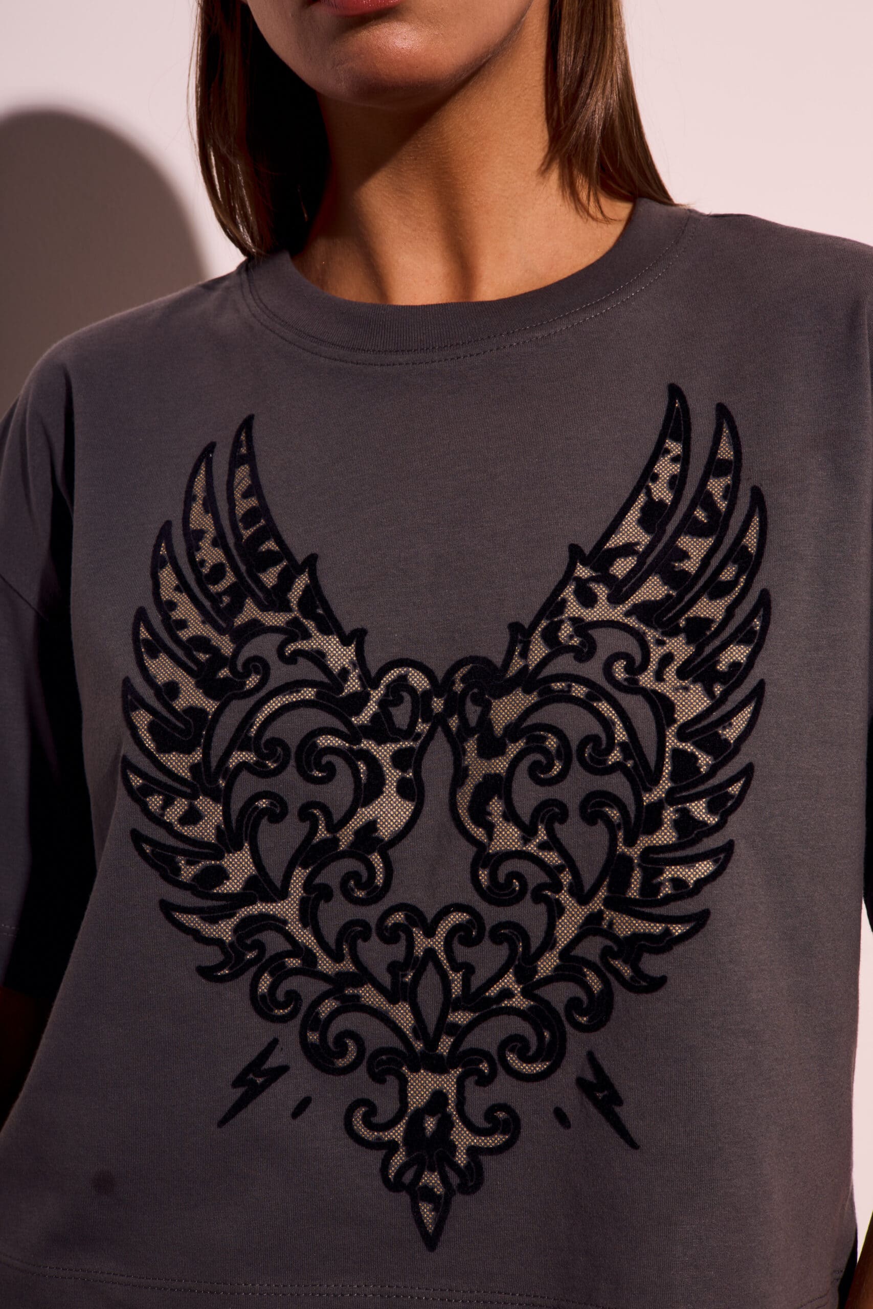 $ 15.000,00Remera de mujer over crop con cuello de rib al tono y estampa central con diseño exclusivo.